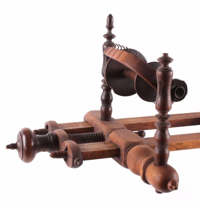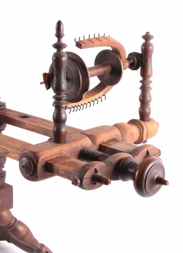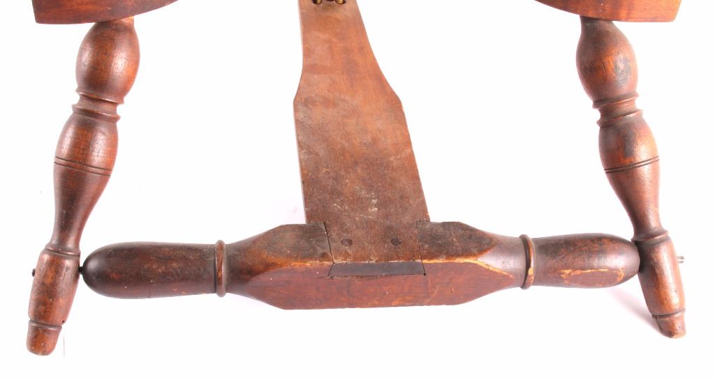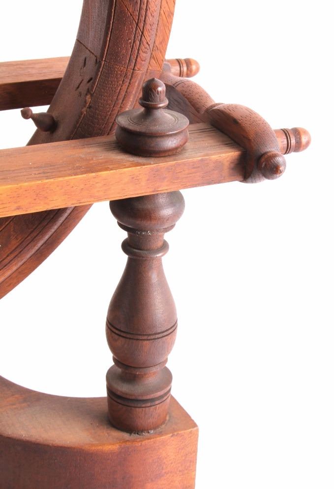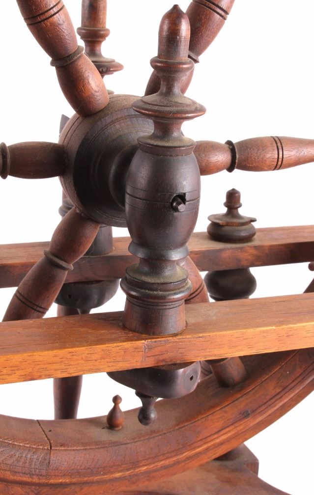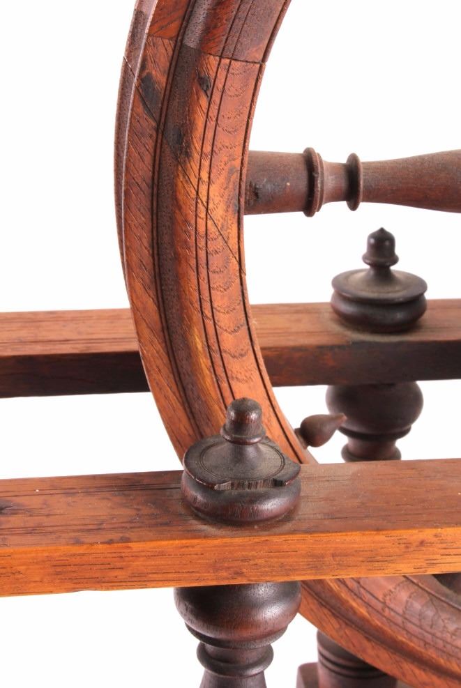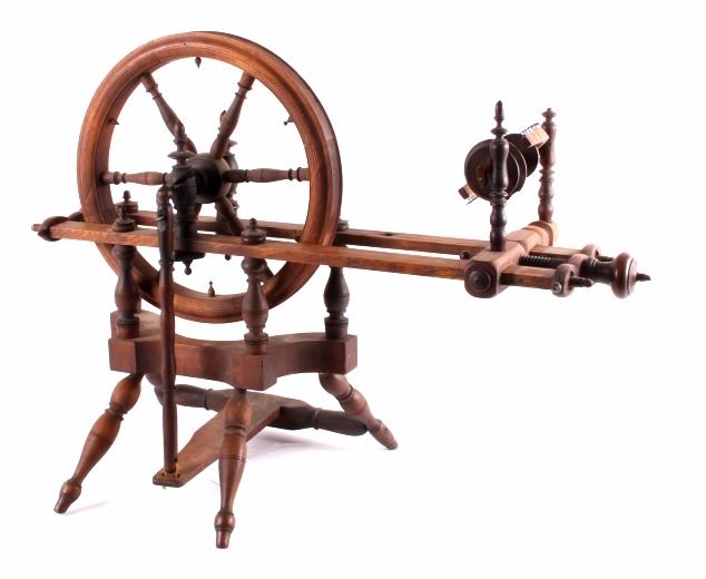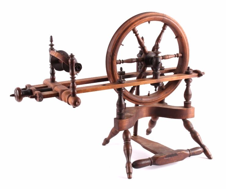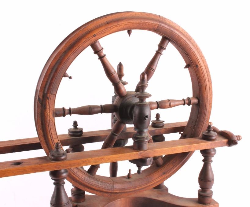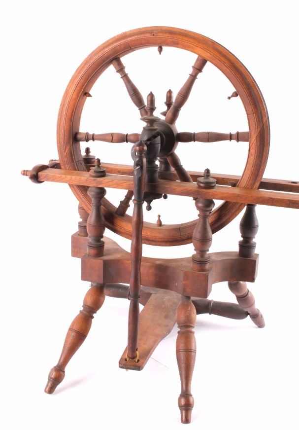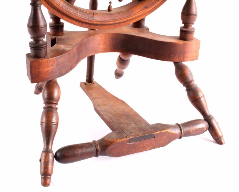 This is an antique wooden spinning wheel. The piece is made from solid wood and appears to be complete. The spinning wheel is in good condition. It measures 15" x 31.5" and is 23" tall.