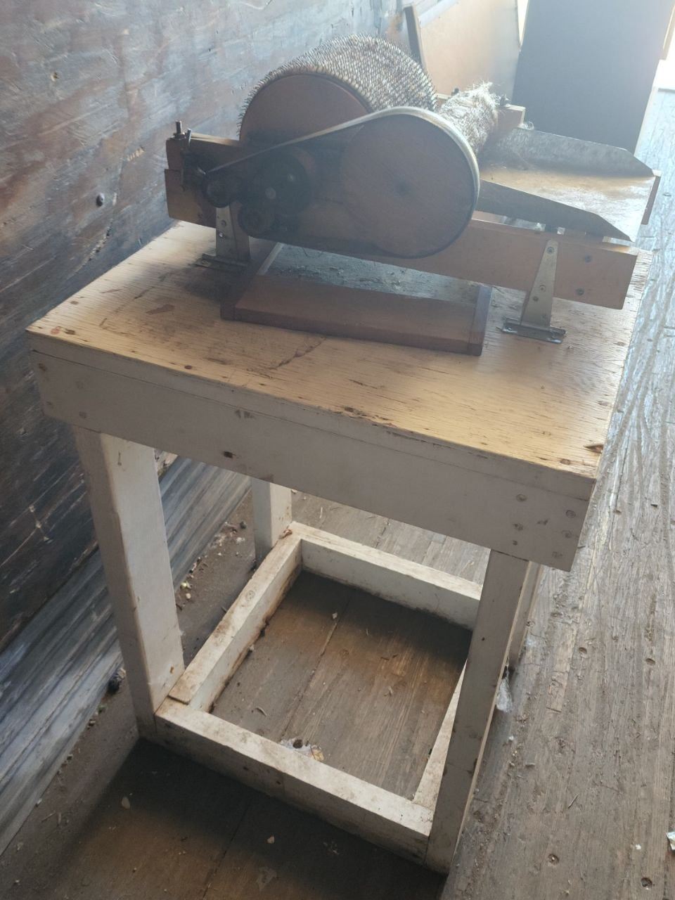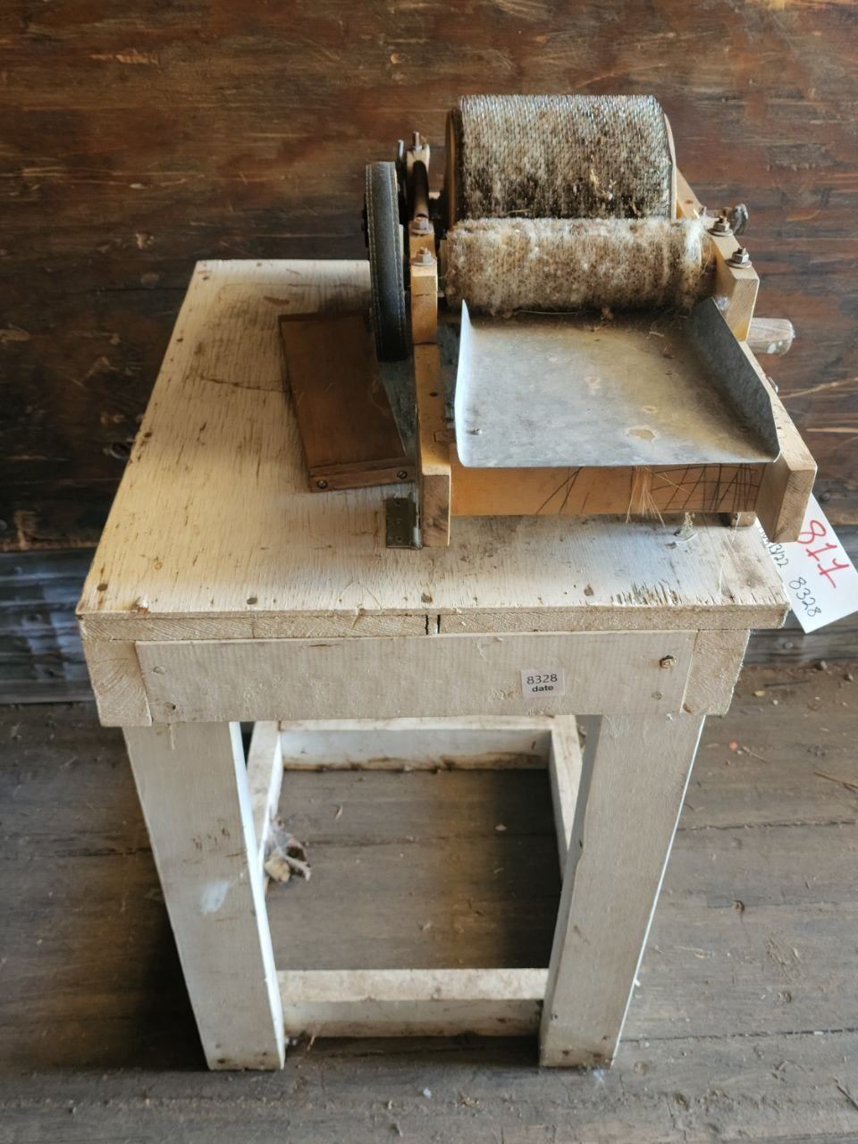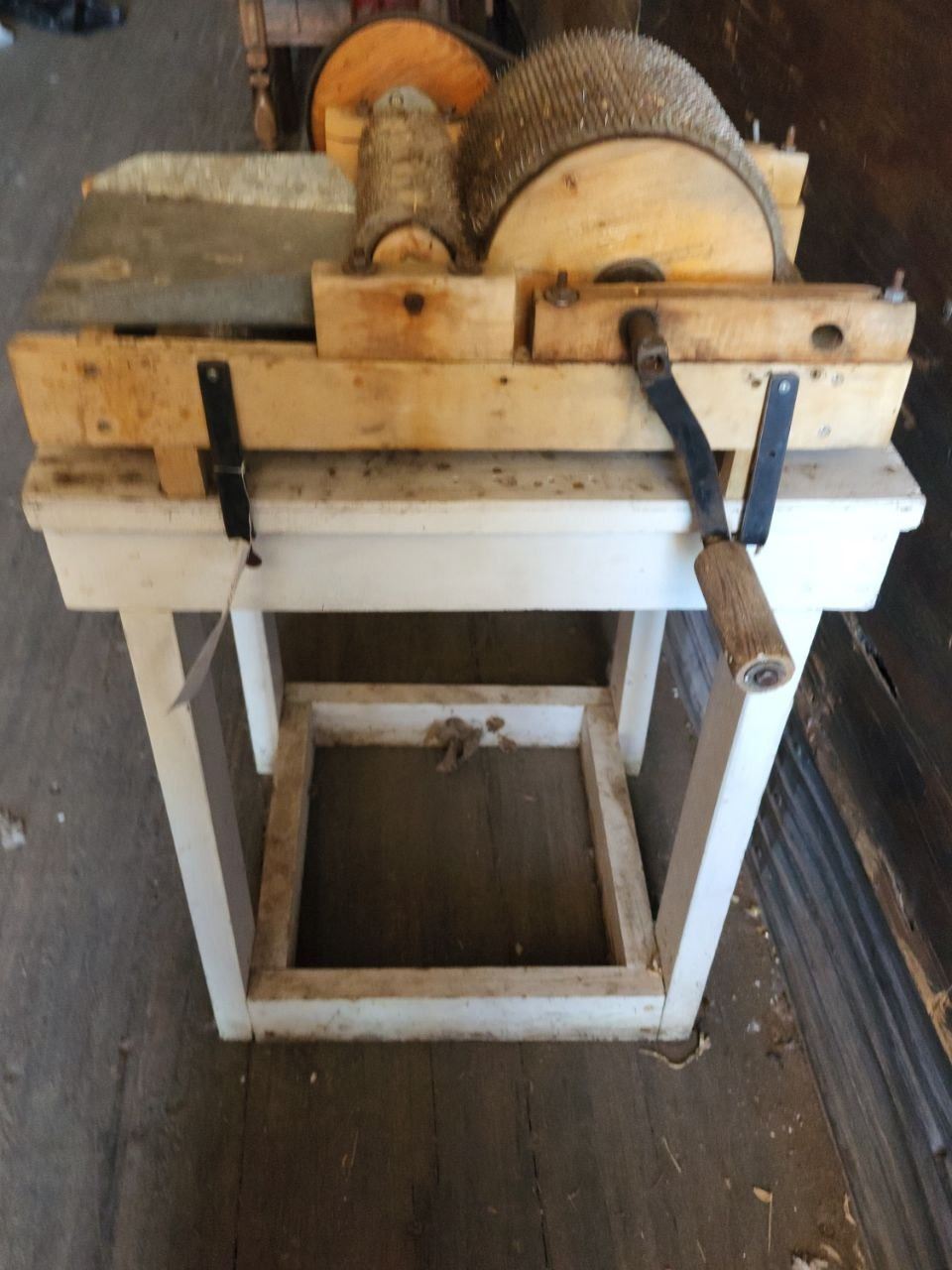 Antique Wool Carder, mounted on White Table. Total H-3'4" W-1'8" D-2'