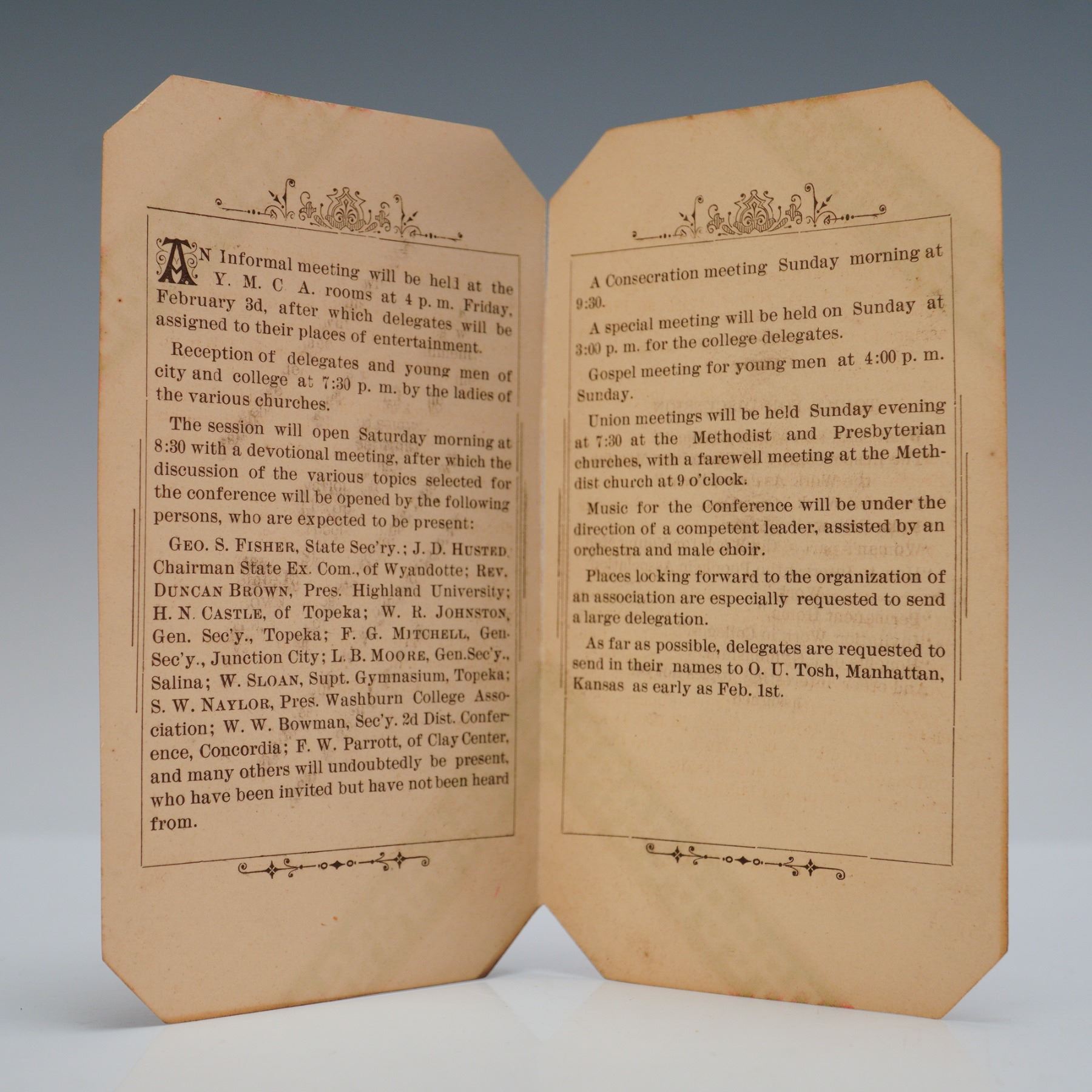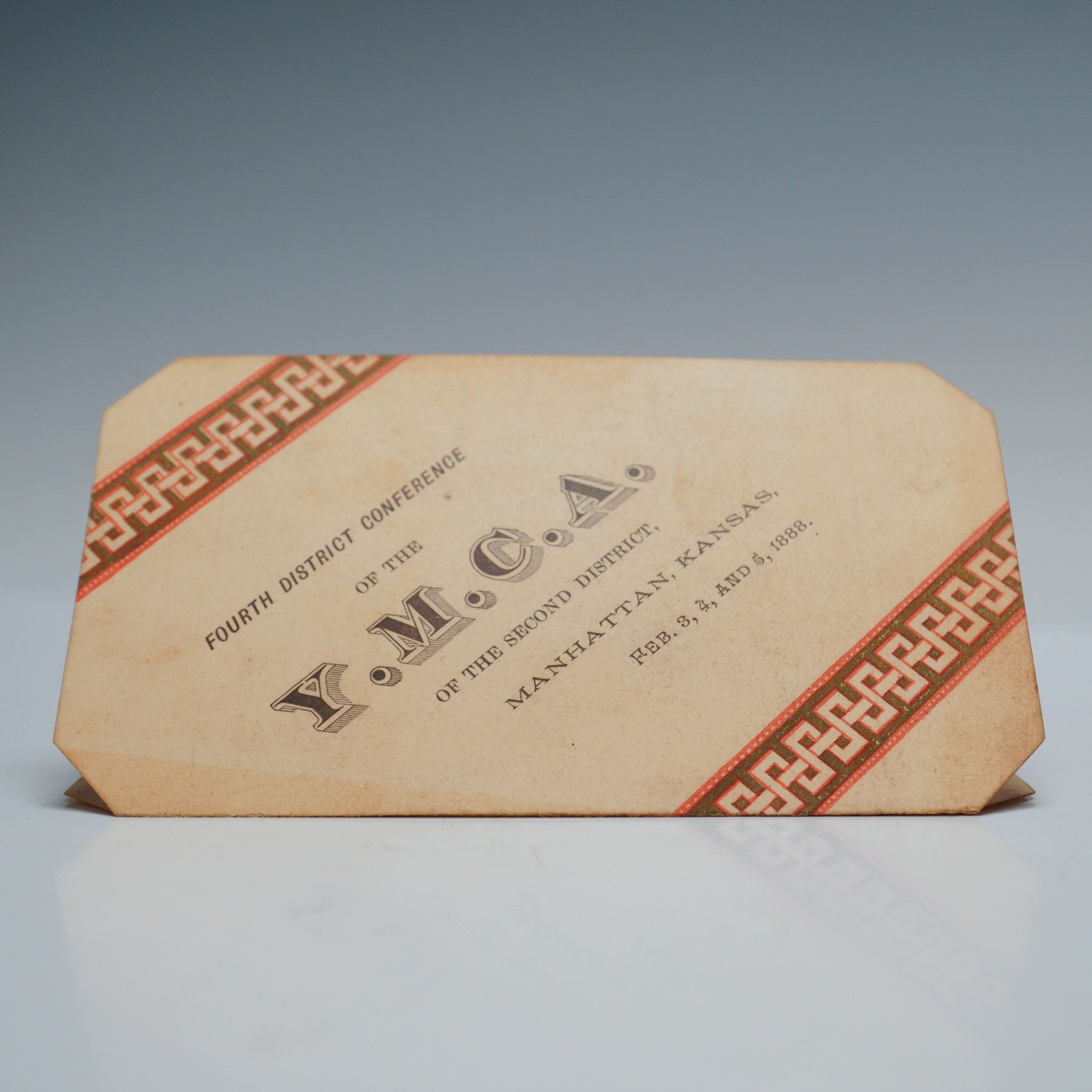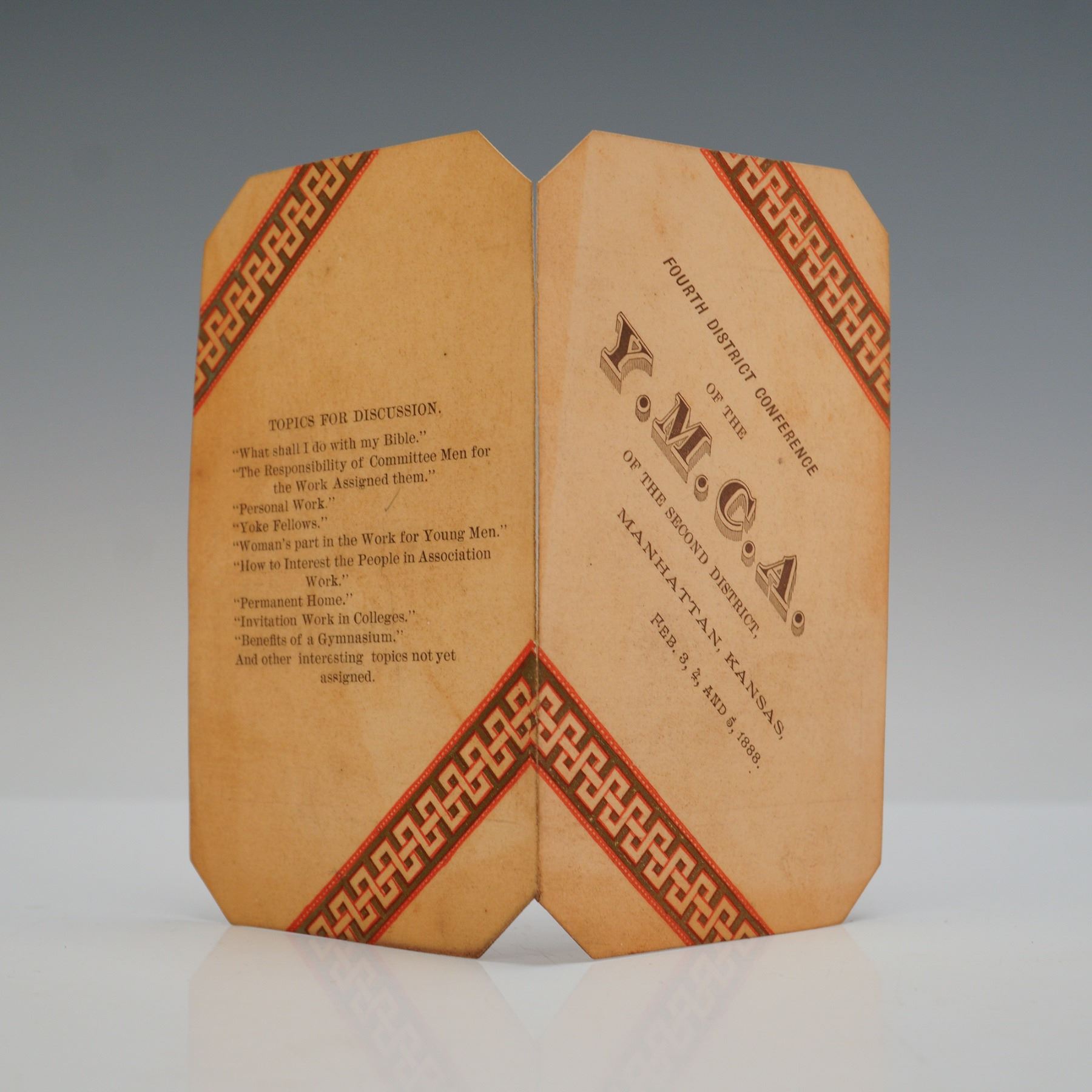 This is an antique program from the Second District Conference of the YMCA of the Second District, held in Manhattan, Kansas, on February 3-5, 1888. The program features detailed information about the conference, including the topics for discussion, notable speakers, and schedules. It is decorated with a vibrant geometric border and includes information about the various meetings and activities held during the event. A unique piece of YMCA history from the late 19th century.