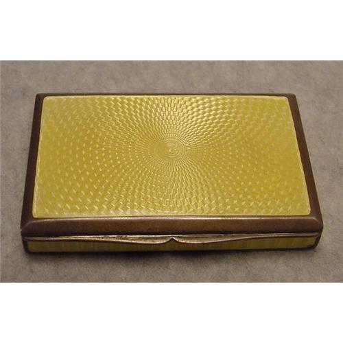 Exquisite yellow enamel and silver gilt snuff box marked with a crown and the number 935. The box is in excellent condition save for two miniscule losses to the front corners of the enameling near the edge. Length 2-5/8 inches, width 1-3/4 inches, depth almost 1/2 inch. The box snaps tightly when shut. The quality is superb.