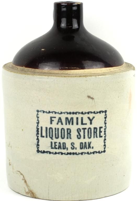 Antique advertising jug, front stamped Family, Liquor Store Lead DAK, home of the now defunct Homestake Gold Mine, scarce jug 10 1/2" tall showing very good original condition with no chips, cracks or repairs. Est. 500-1000