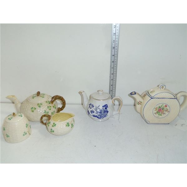 3 Vintage Teapots and Cream and Sugar Set Green Leaves are Belleek Ireland