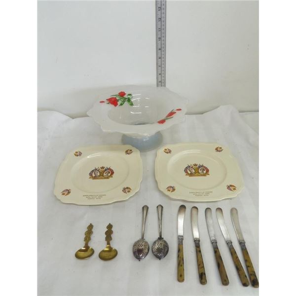 Queens Dinner Plate is Compliments of Ponoka U.F.A. Nabob Coffee Spoons, 5 Knives and Tea Leaf Holder Spoon