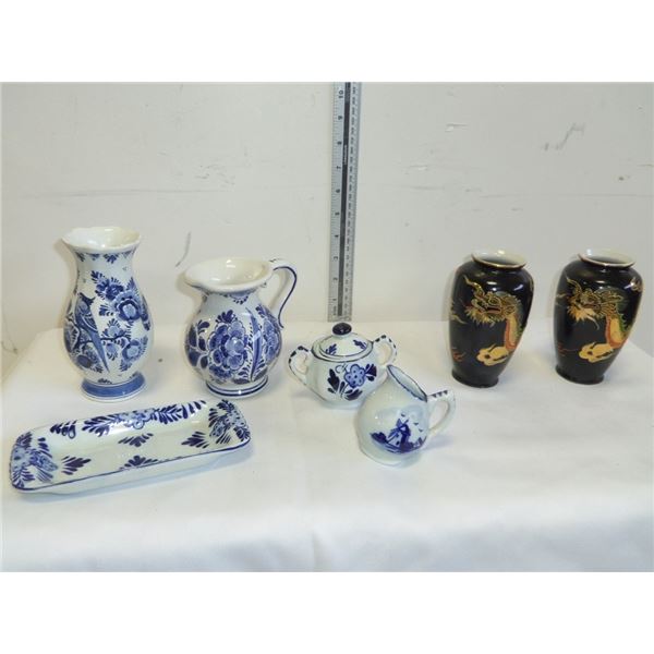 Delfts Blue Mini Vases, Tray and 2 Asian Vases