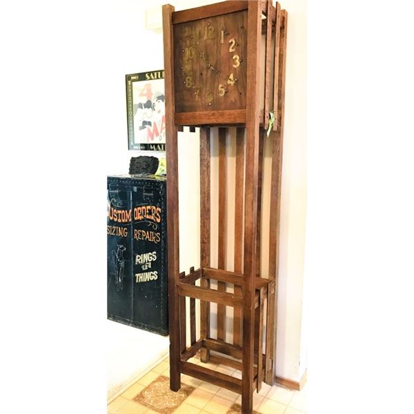 Mission style, Stickley era, arts and crafts oak tall case grandfather clock. Maker unknown. It has the key but is missing part of the pendulum,