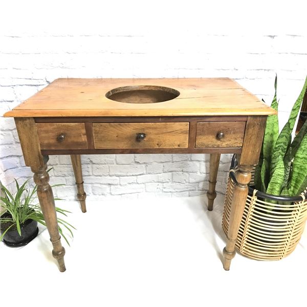 Antique washstand with one working drawer and 2 false fronts. Note: stand has been pieced together, but the original wood top has aged beautifully.