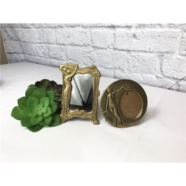 Brass miniature art nouveau mirror and picture