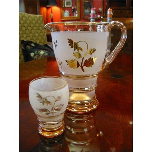 This is a fantastic true Art Deco glass pitcher and single glass with gold hand painting as detail. The glass itself is a soft brown color and has gold leafing paint as a decorative color. The glass is hand blown and in very good condition.Circa 1920. the glass goblet is 4.75" tall.