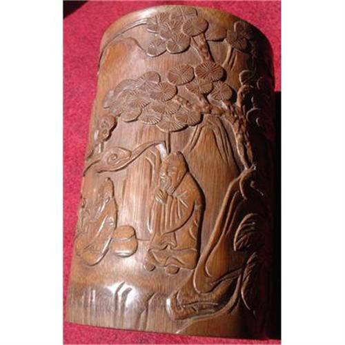 19th.-20th. century bamboo carving in shape of a brush holder. This was a highly prized scholar's item used to keep the calligraphy brushes. The sides are carved with master skills featuring an old man fishing in a pond with ducks. He is accompanied by another old man and a child in an idyllic surrounding with pine trees and luxurious vegetation. Estimated value: $1200.