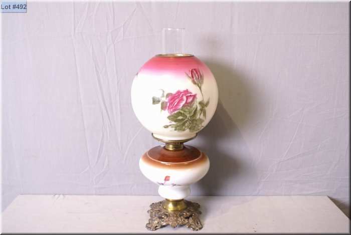 Antique banquet lamp with cast base and hand painted bowl and globe