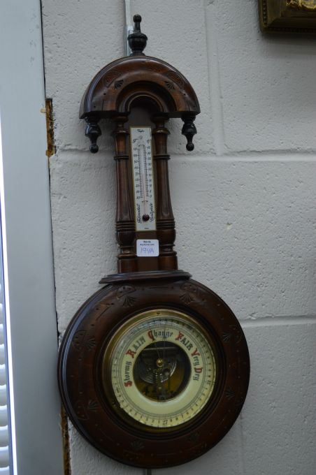 Antique barometer in delicately carved frame and finials and enamelled dial