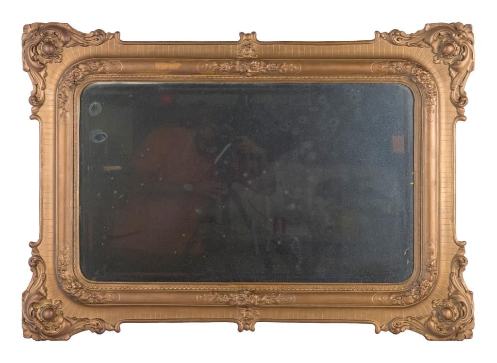 Antique bevel glass mirror with fancy gesso over wood frame circa 1900 or before. The mirror measures approximately 41” x 28” to the outside edges of the frame. The mirror shows some fogging and losses of silver coating on the glass. Faircondition only. Est.: $50-$150.