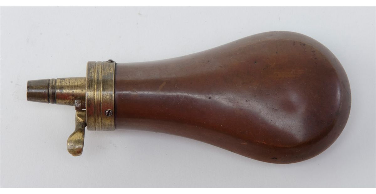 Antique brass flask for a pocket percussion revolver in overall good condition with pleasing patina; missing actuating spring. Est.: $75-$100.