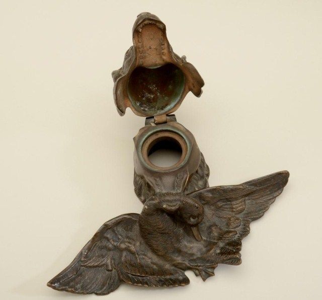 Antique brass inkwell in for of dog with game; 12” across, 5” in height, no glass well for ink, head hinged. From the estate of Robert Petersen. Est.: $175-$350.