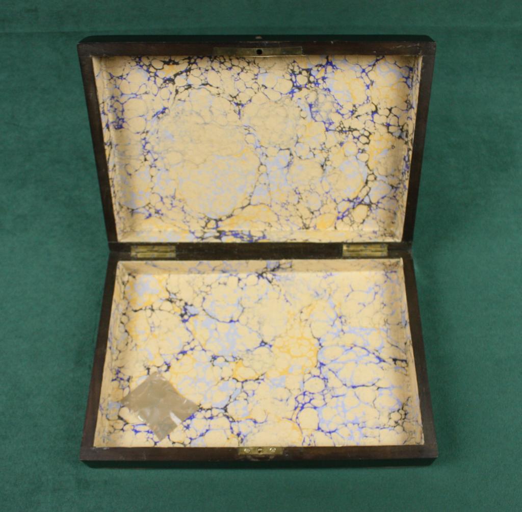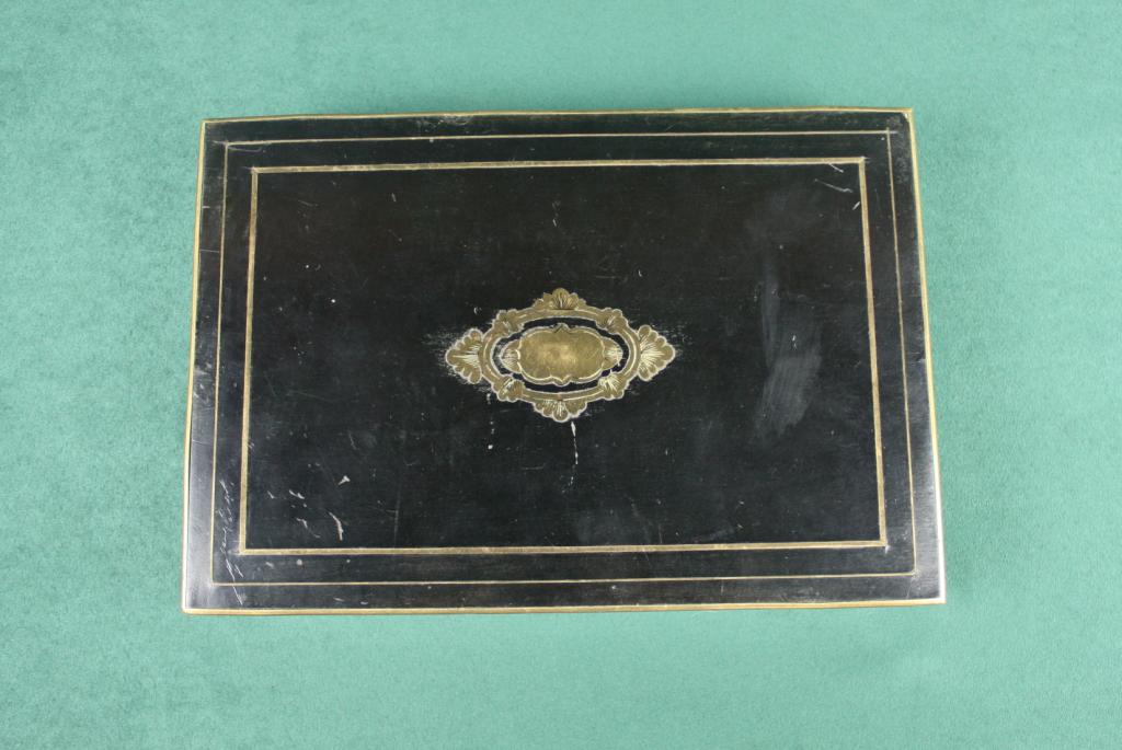 Antique brass inlaid box approx. 10-1/2” x 7” x 2-1/4” in overall very good condition showing black paint on the outside of the box with some scattered mars and scratches from storage, nicely inlaid brass edges to the lid as well as additional rectangle inlays and a beautiful brass inlaid plaque in the center of the lid; bottom of the case is leatherette lined, interior is lined with designed paper interior reminiscent of the1870’s-1890’s or earlier by our estimation of the age of this box; no partitions. Est.: $150-$300.