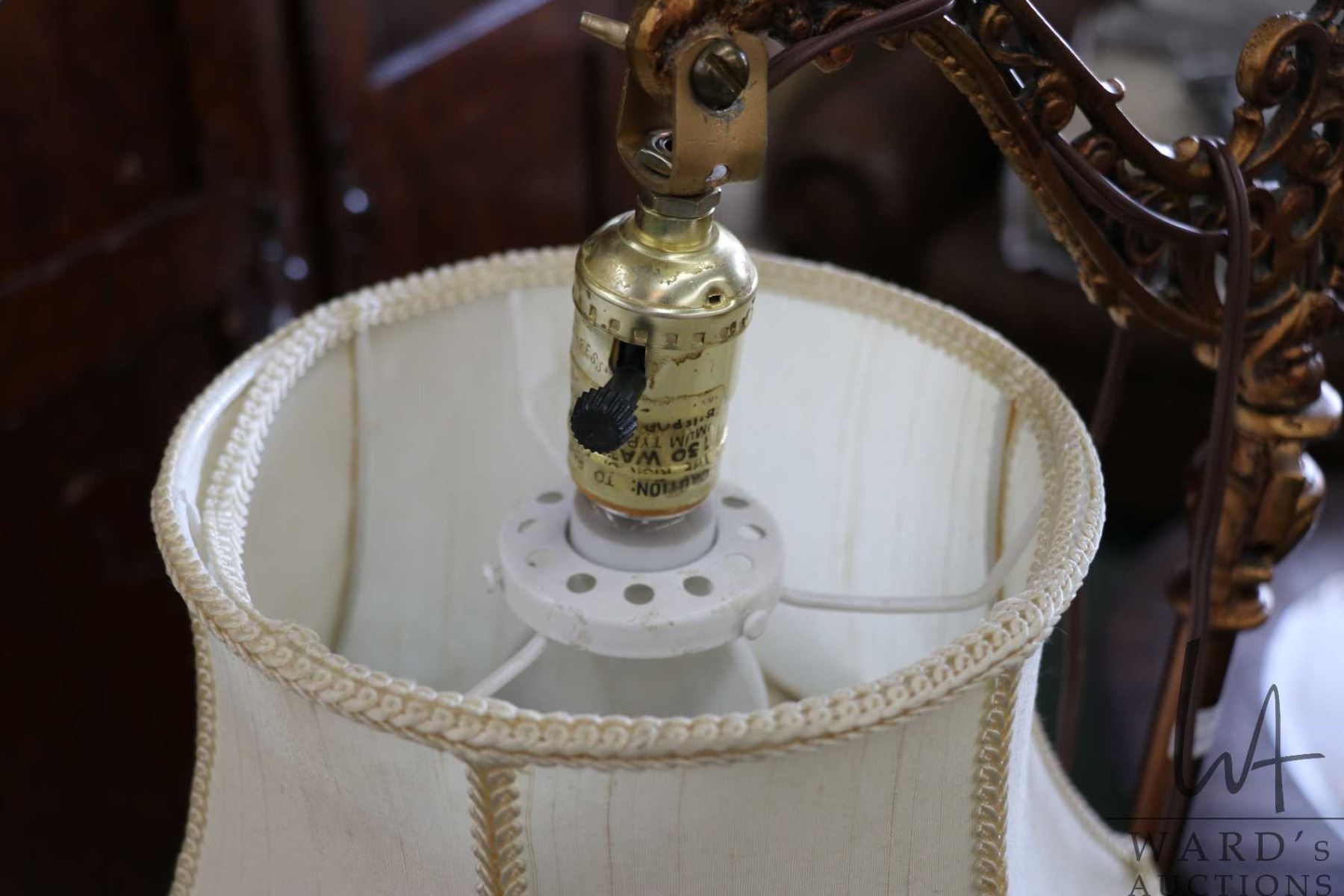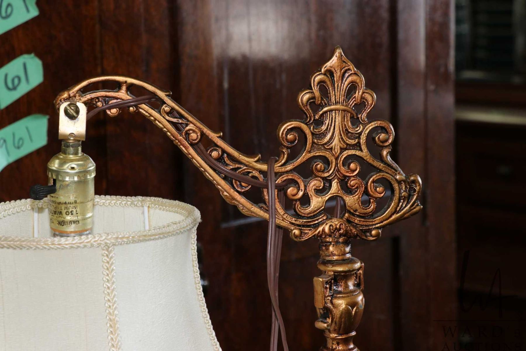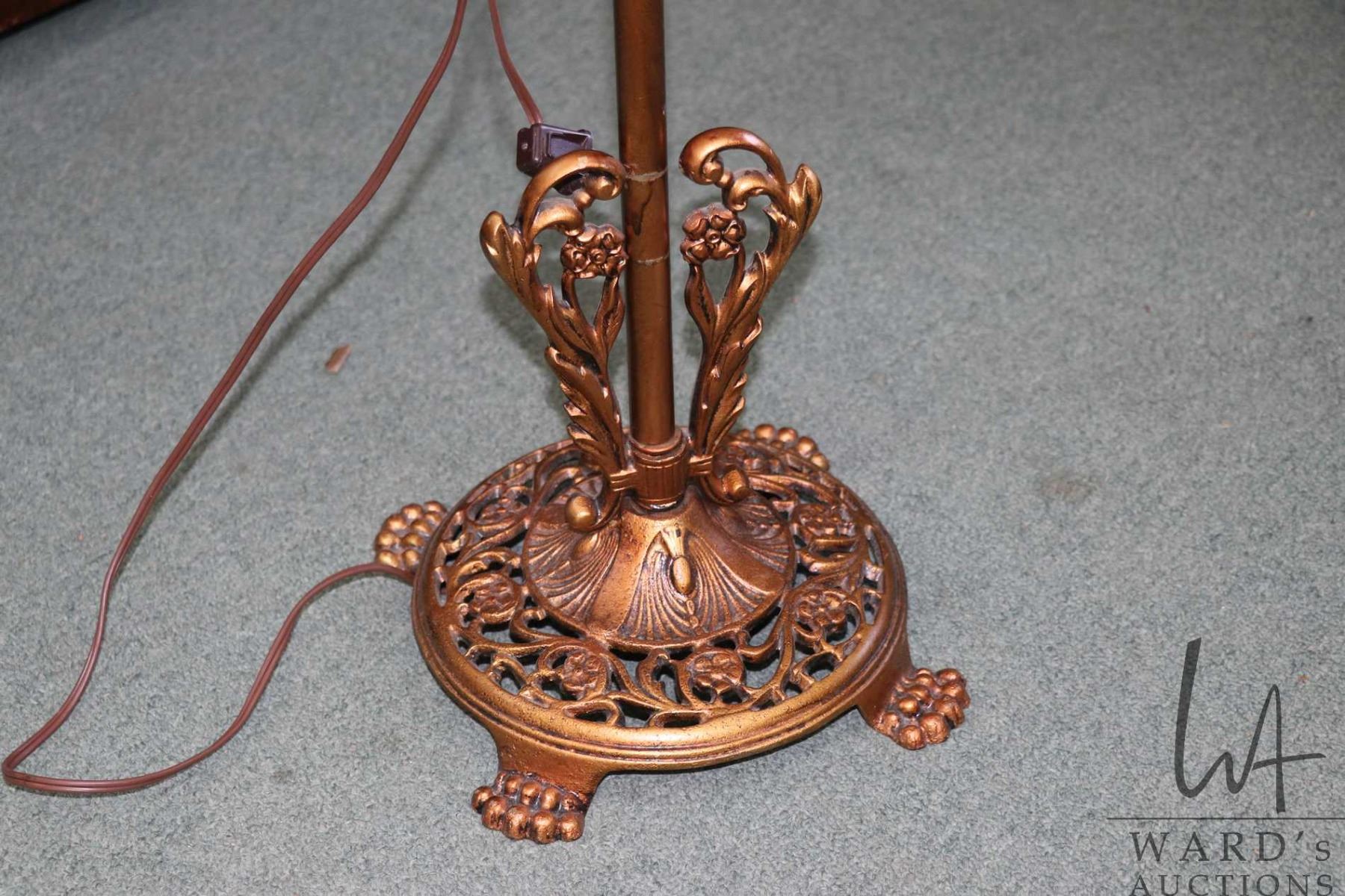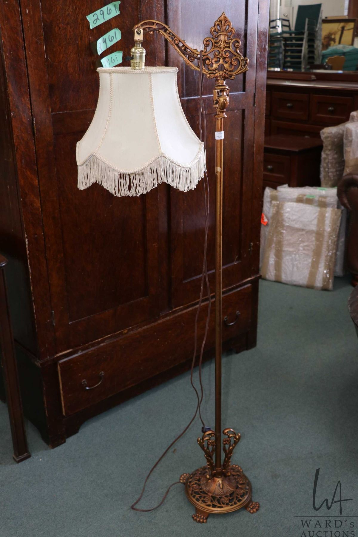 Antique bridge lamp with cast base and topper, fitted with newer shade. Note: Not available for shipping. Local pickup only