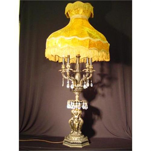 </font></strong>Antique bronze five arm lamp with crystal .Three figurine reised on octagonal base holding colum with five arm lamp, dresed with crystal.Dimension overall height with shade 50" height to the socket 32" five arm diameter 15" base diameter 9 1/2".</font>