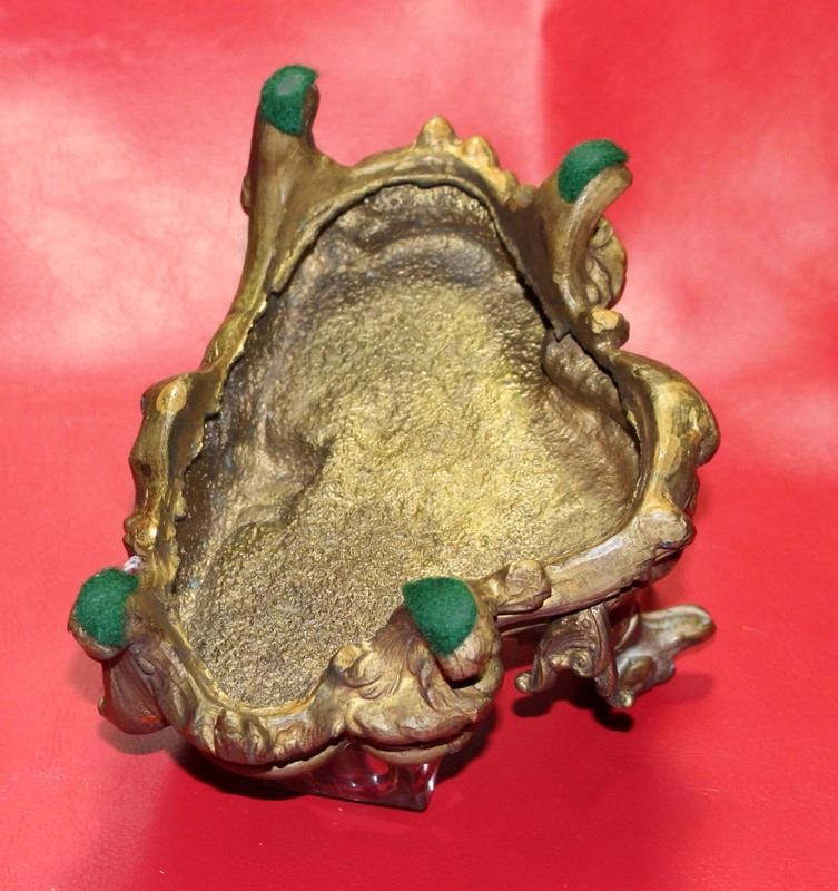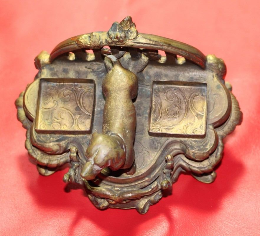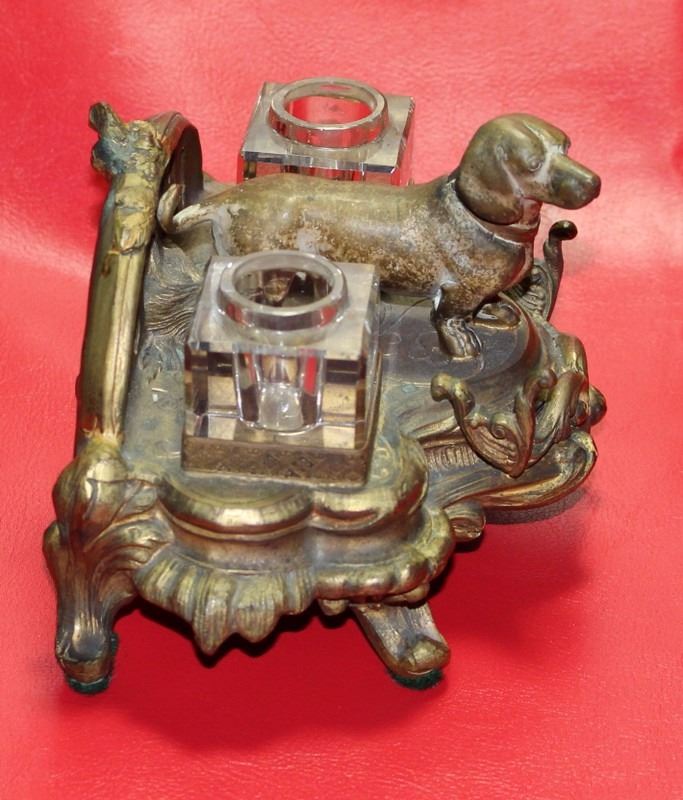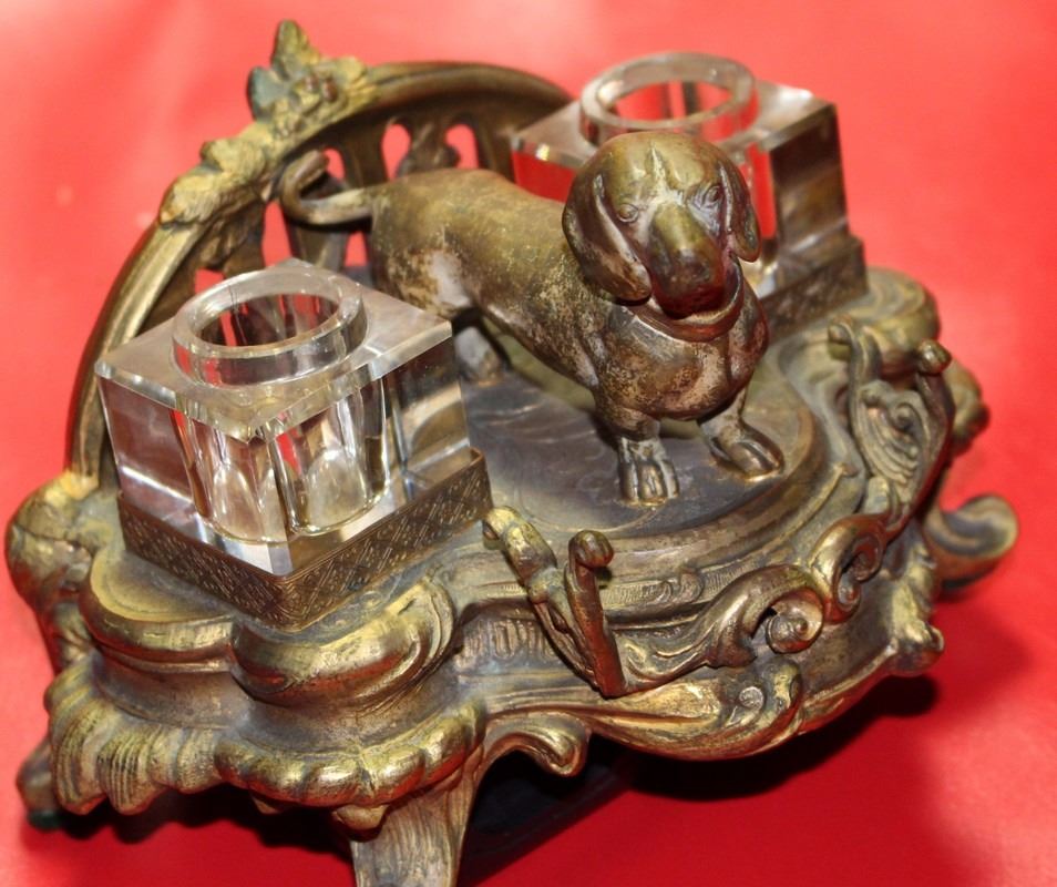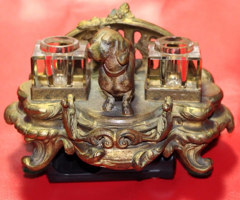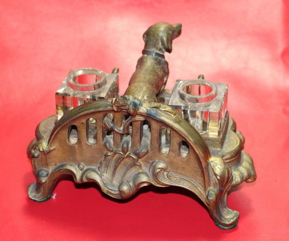 Antique c1870 Gilt Bronze Cut-Crystal Double Inkwell w/ Hunting Dog Centerpiece