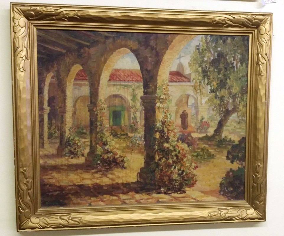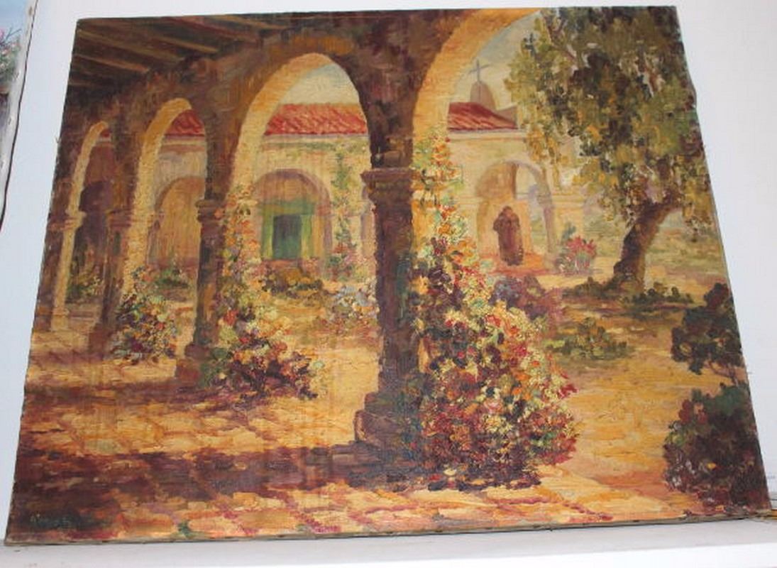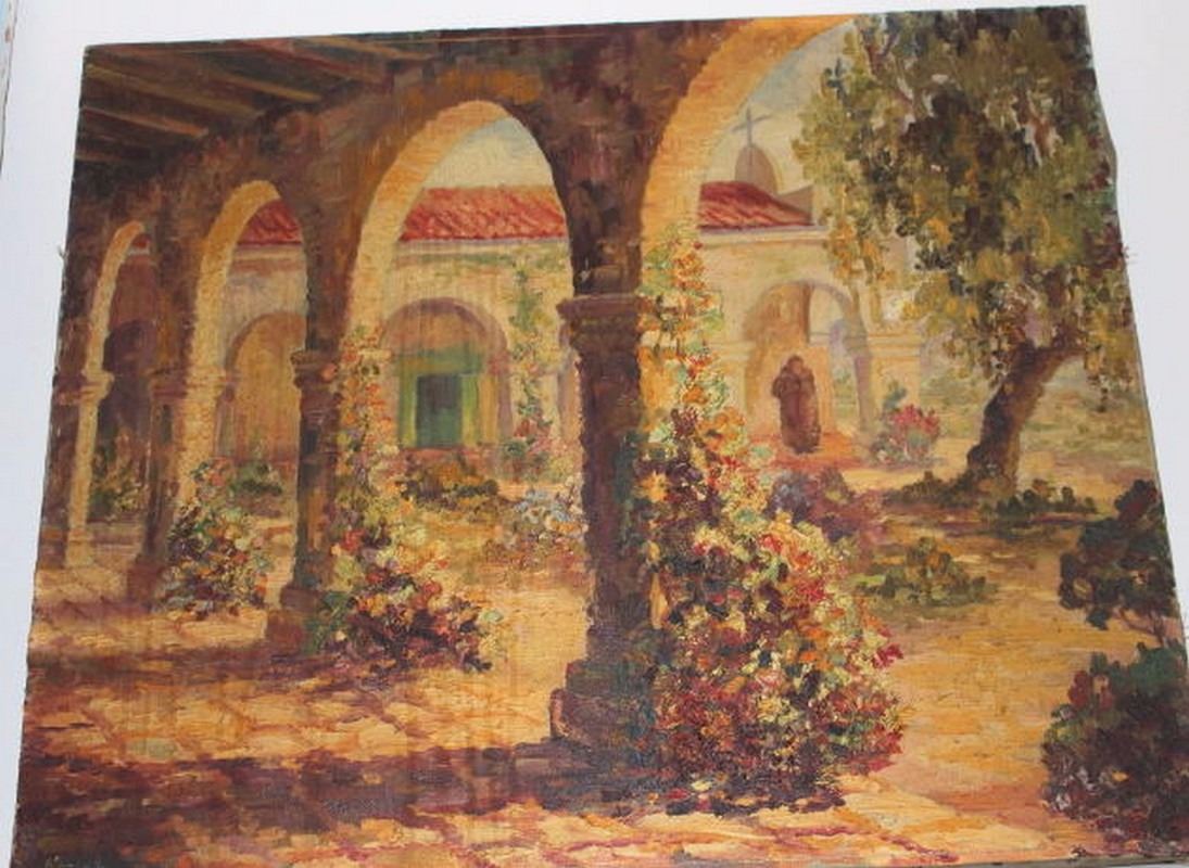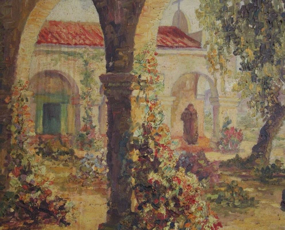 Antique c1917 Original Oil on Canvas Signed Franciscan California Mission Scene Villa likely in San Juan Capistrano or Santa Barbara (Southern California Landscape) Signature is not completely discernible.