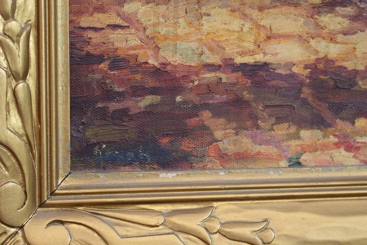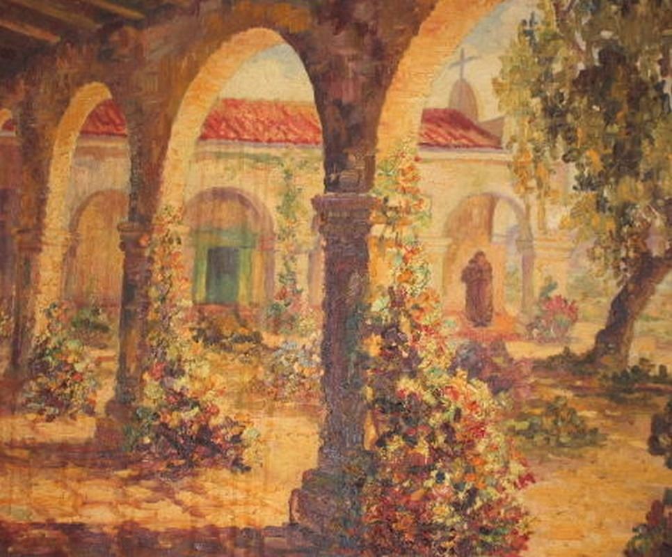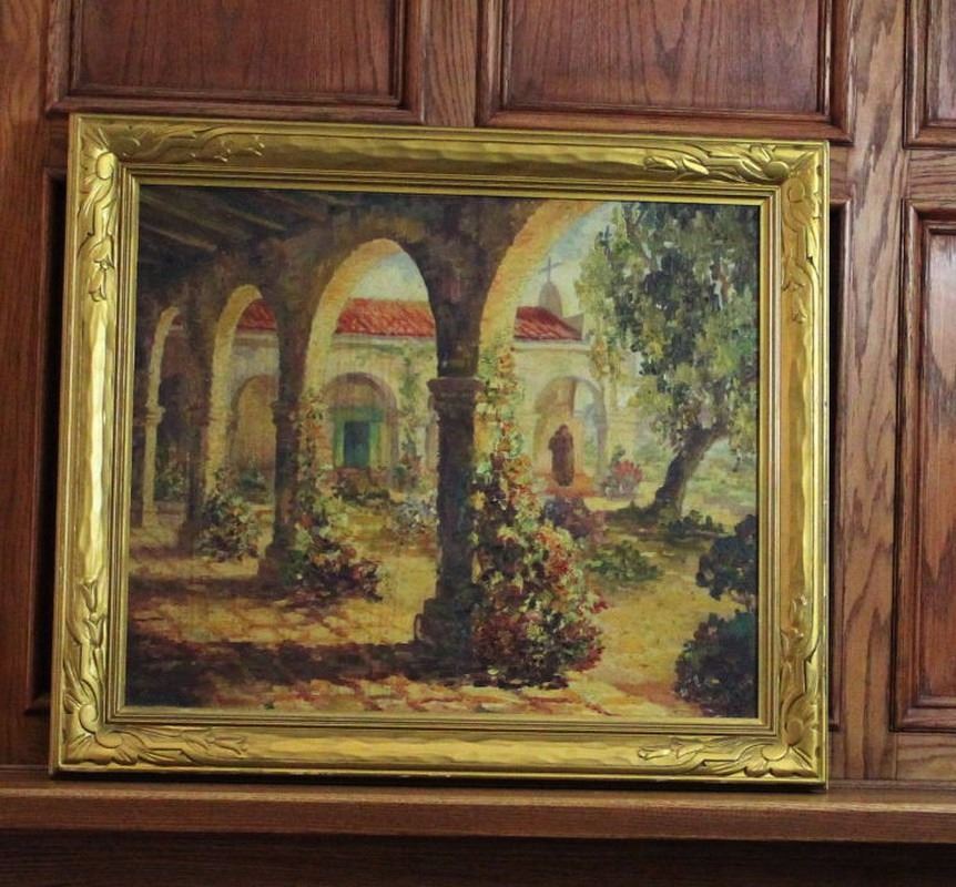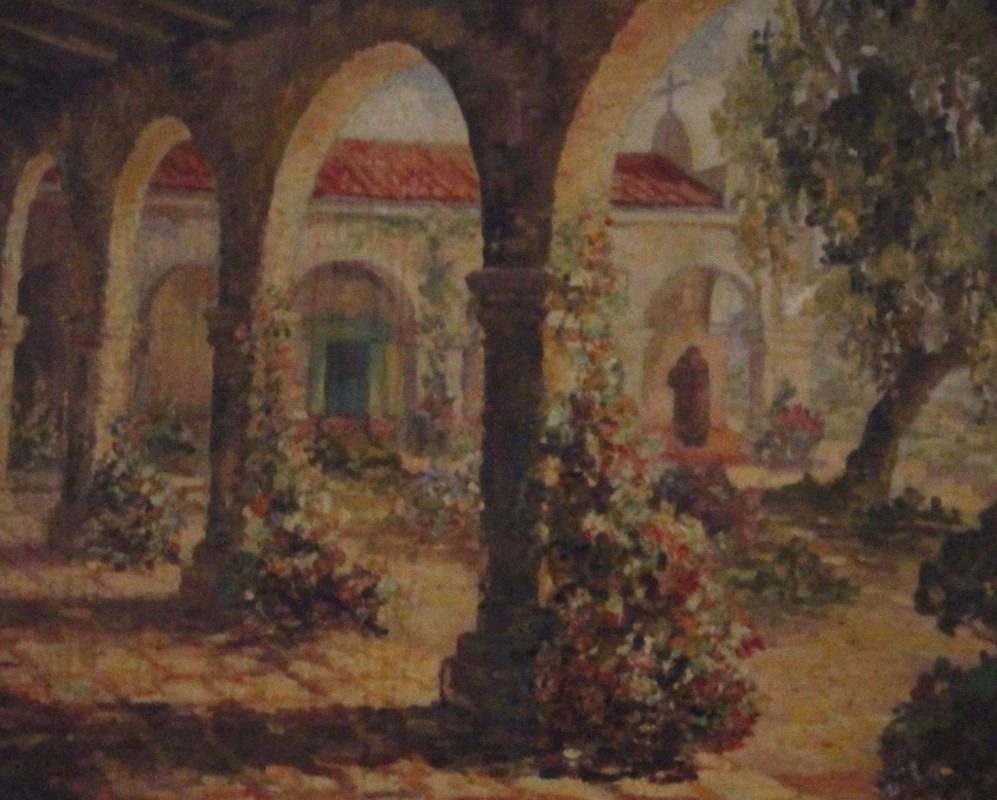 Antique c1917 Original Oil on Canvas Signed Franciscan California Mission Scene Villa likely in San Juan Capistrano or Santa Barbara (Southern California Landscape) Signature is not completely discernible.