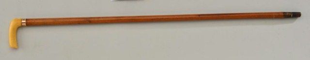 Antique cane with carved grip and gold feral inscribed "D.G. 1883" in period script letters. The tip is horned and the shaft is a light colored hardwood probably Malacca. The cane measures 34" in length the gripapprox 3-1/2". Est: $350-$700.