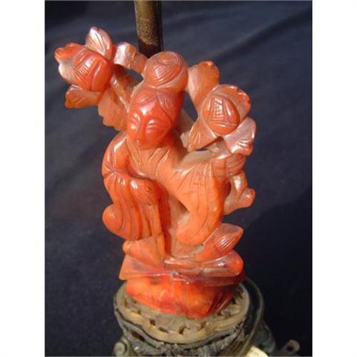 18th-19th. century carnelian carving in shape of Guan Yin holding lotus flowers. The carving is on a white, reticulated jade plaque and was mounted in a lamp in the 20th. century. Lamp length: 11" (28 cm.). Carnelian carving height: 5" (12 cm.). Width: 2.3" (6 cm.). Jade plaque: 2.5" (6.5 cm.). Estimated value: $3000.