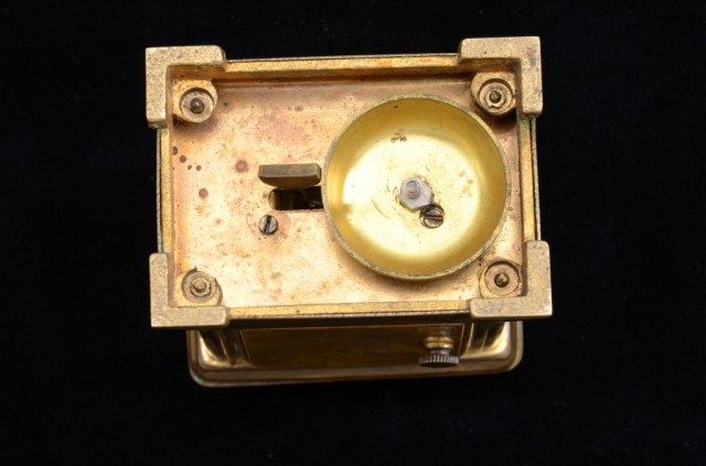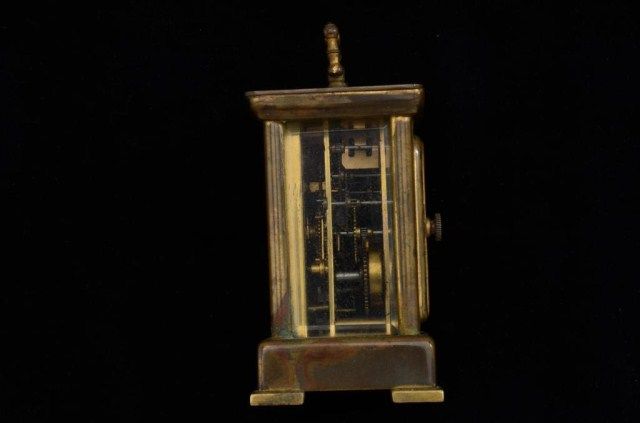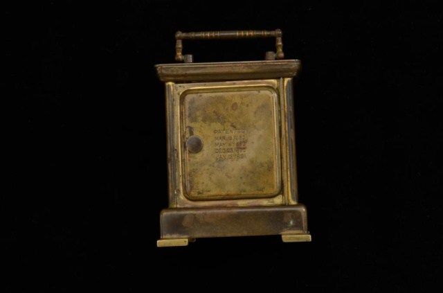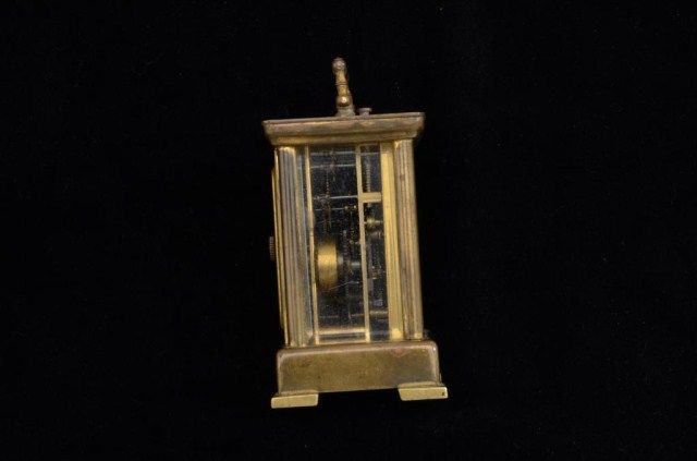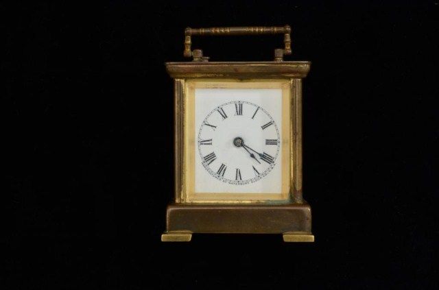 Antique carriage clock by Waterbury clock Co., last patent date Jan. 13, 1891 with bells; working at time of description, approx. 4” high, 3” wide and 2” deep. Est.: $100-$200.