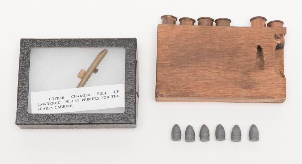 Antique cartridge box with wood block containing 6 rimfire shells, copper charger full of pellet primers for sharps carbine, and other items. Est.: $250-$500