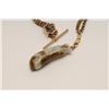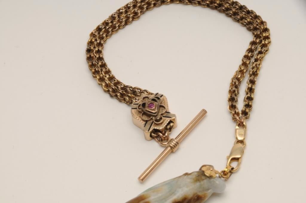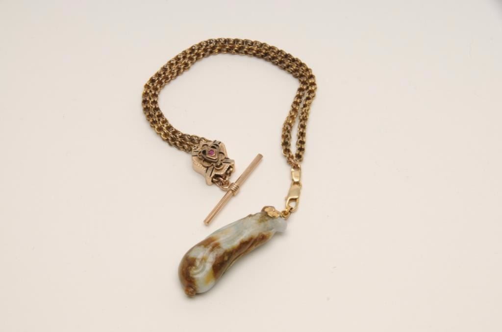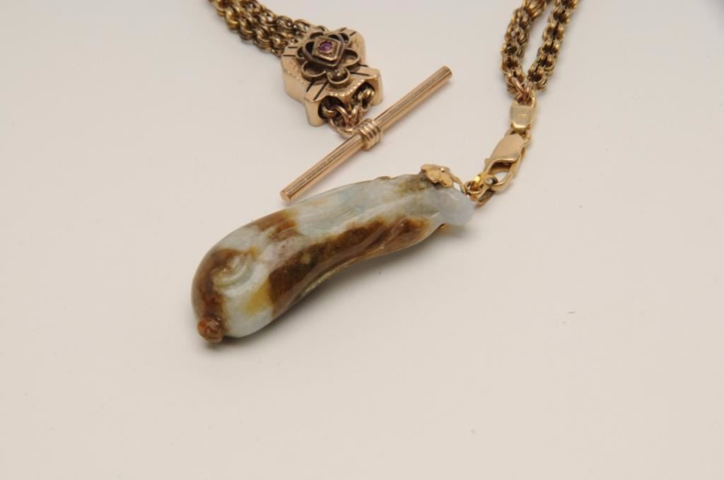 Antique carved jade showing multi colors from green to violet with browns. Gold mount on gold filled antique watch fobs. The jade is exceptional and in our opinion dates pre-1900. The watch fob is 1920s or before.Est.: $300-$600