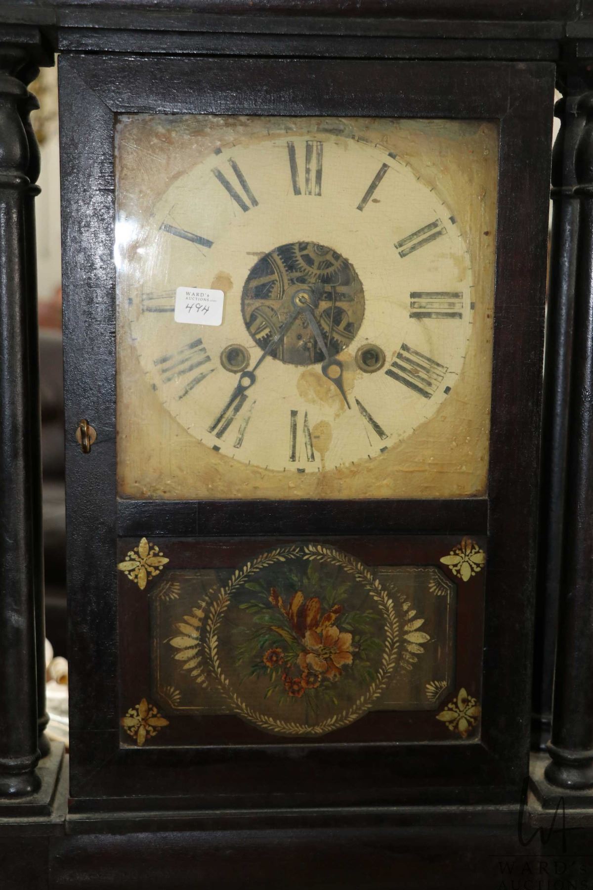 Antique chiming clock with reverse transferware floral scene, not working at time of cataloguing, needs weights and possible other parts, 26" high. Note: No shipping, local pick up only