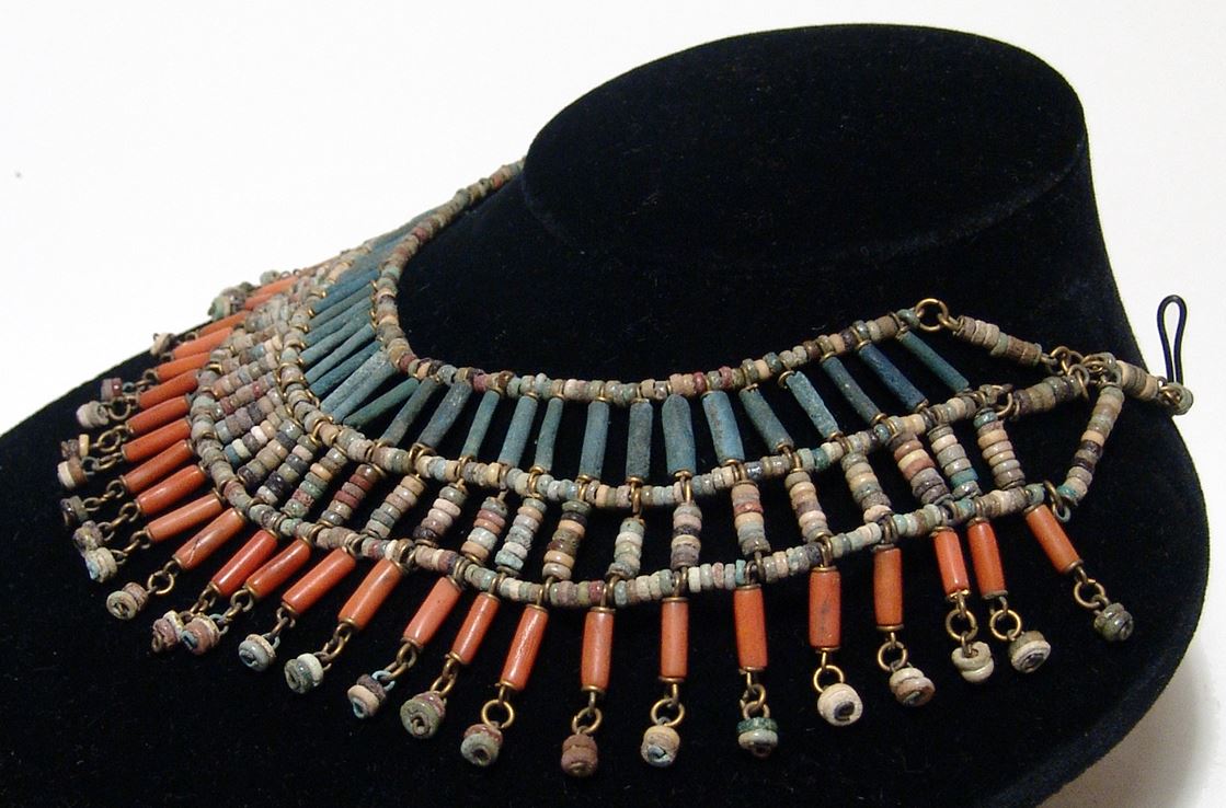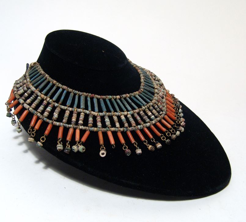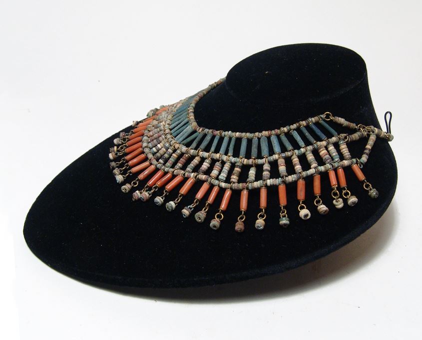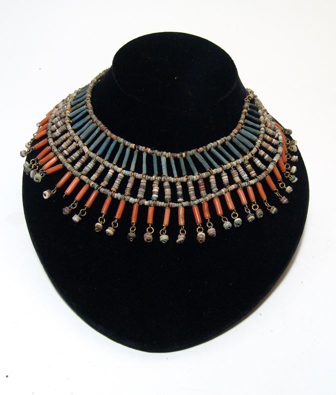 A choice antique collar composed of ancient Egyptian beads, Late Period, c. 664 - 30 BC, the beads consisting largely of multicolored faience disk and tube beads, the lower edge of the necklace with carnelian tube beads in a nice medium orange. 7 ¾ in x 6 ½ in (19.8 x 16.5 cm). The collar has been reconstructed on ancient models on brass wire, ready to wear! Included is black velvet display mount. Ex Philadelphia private collection.