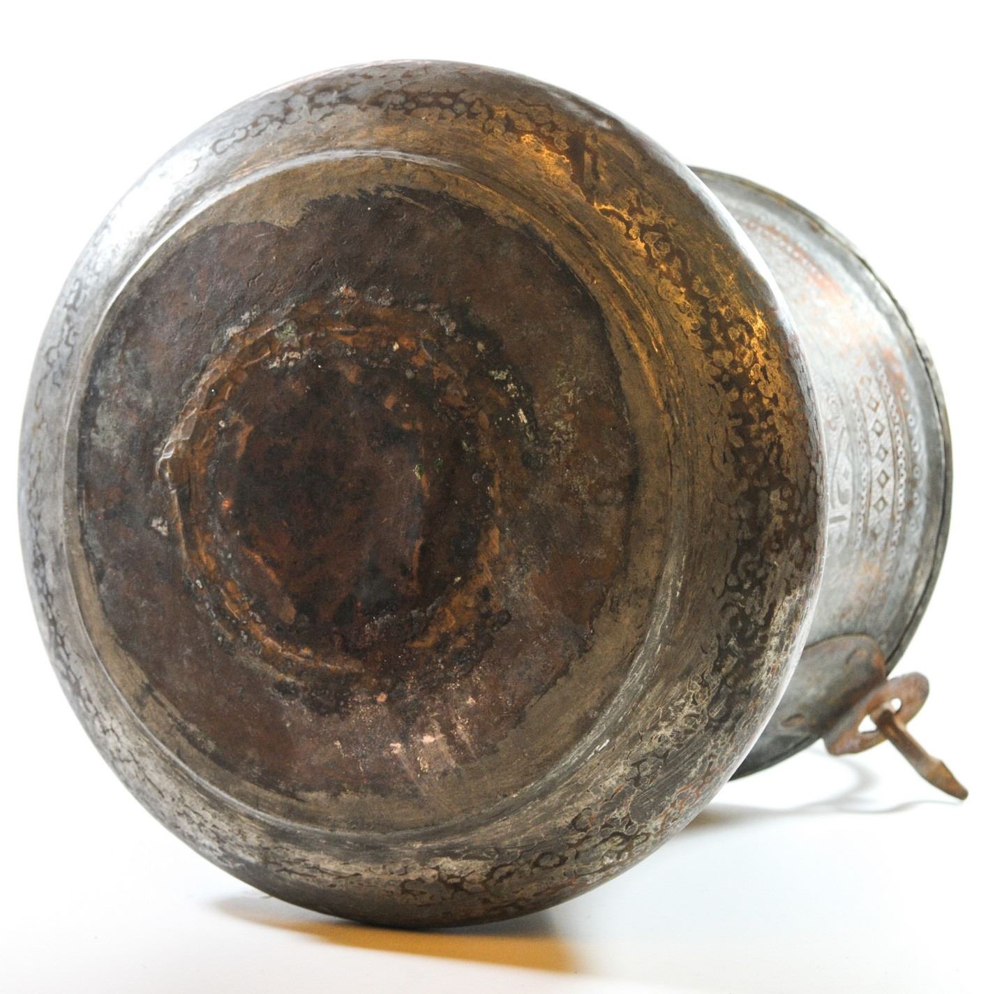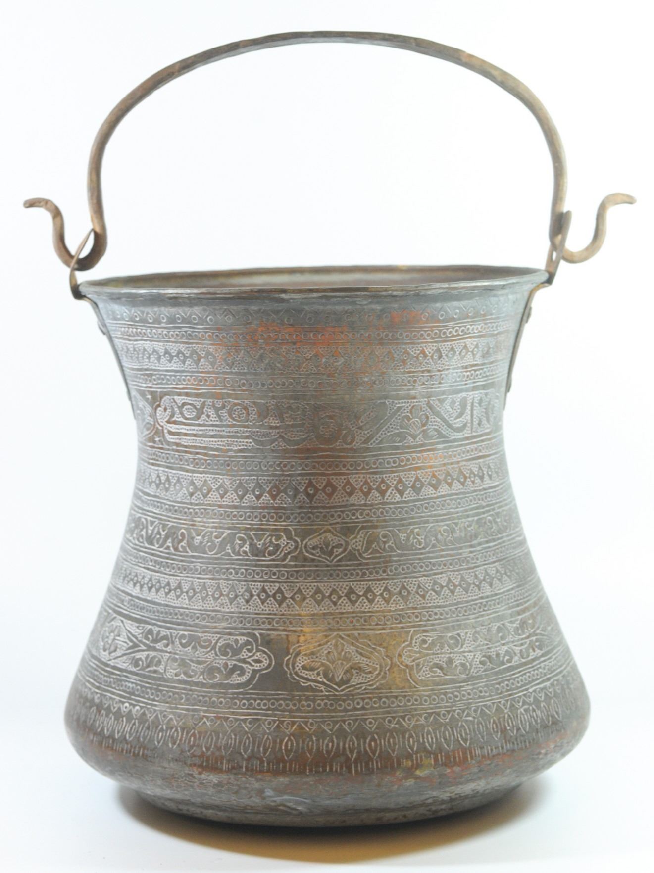 Antique copper pot, Kashgar - on the border with Afghanistan, with carvings of geometric decorations, plants and lettering, height (without handle): 27.5 cm.