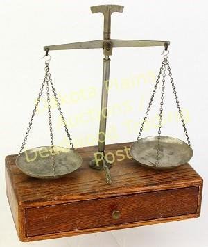 Antique counter top scale on oak base with drawer, complete with pans, working order, 13" tall. Est