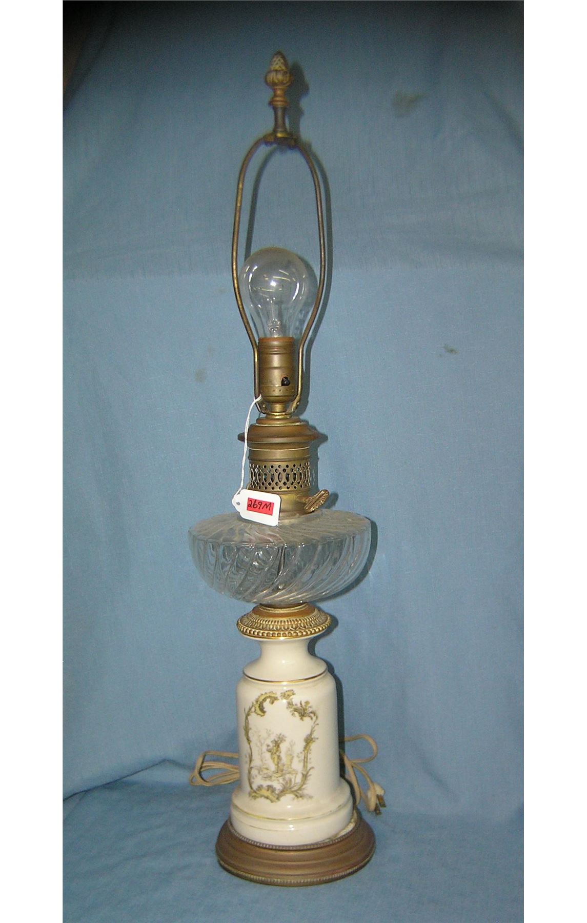 Antique crystal, porcelain and brass table lamp paint decorated Victorian scene on porcelain nice solid brass acorn finial circa 1930's est. value $200.00-$225.00