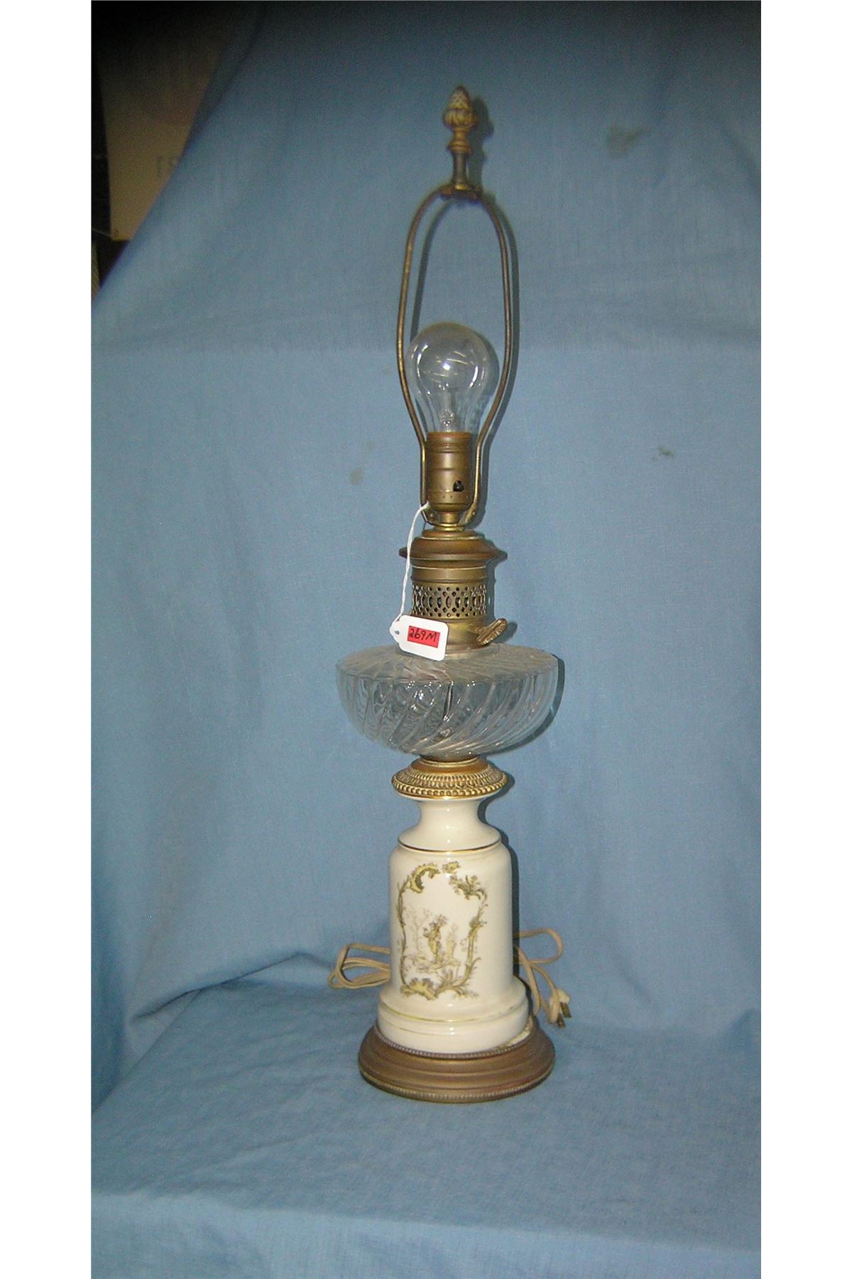 Antique crystal, porcelain and brass table lamp paint decorated Victorian scene on porcelain nice solid brass acorn finial circa 1930's est. value $200.00-$225.00