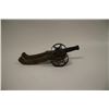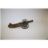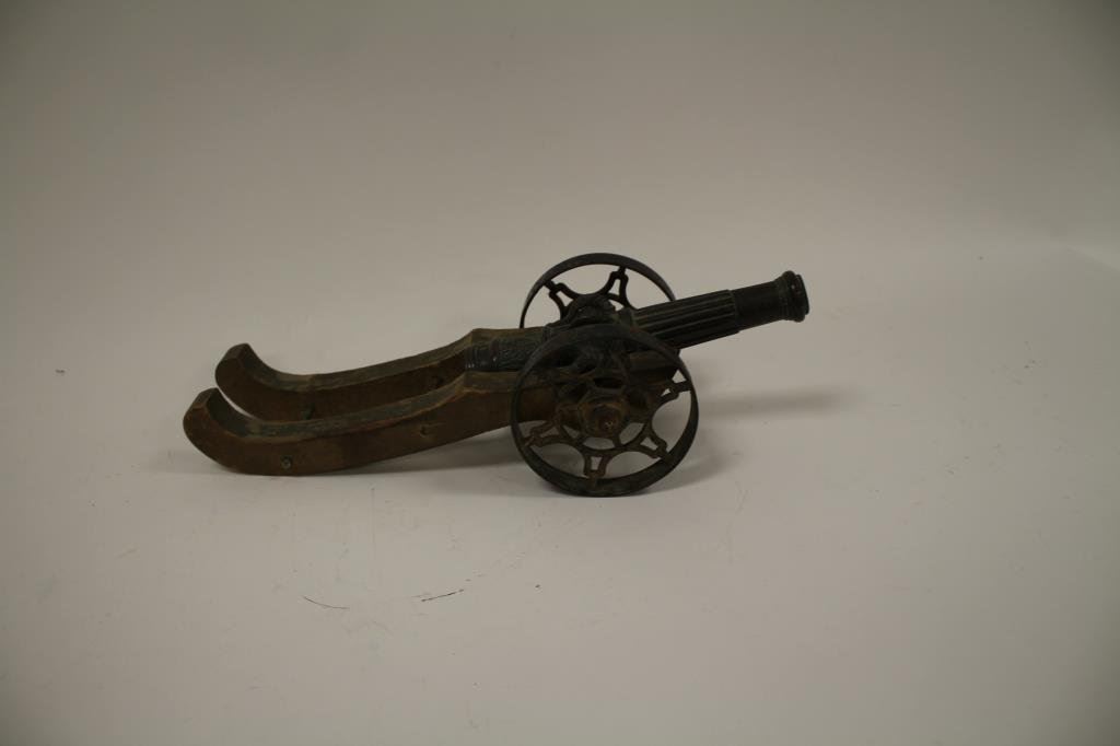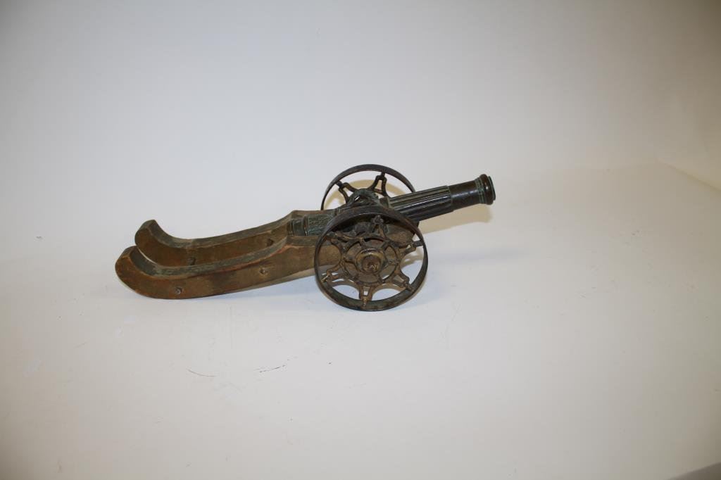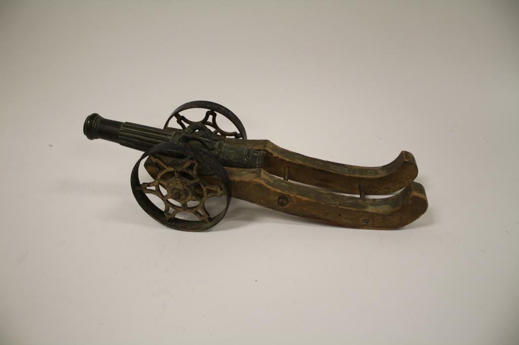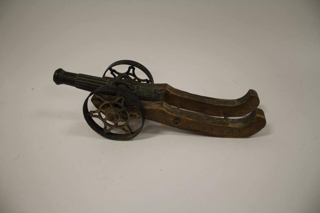 wooden carriage with iron wheels in archaic style. Measures 16” from tip to end. 9” tube of high quality not drilled and open breech so it cannot be fired. Great patina. Measures 5” in height. Late 19th to early 20th century. Est.: $150-$300