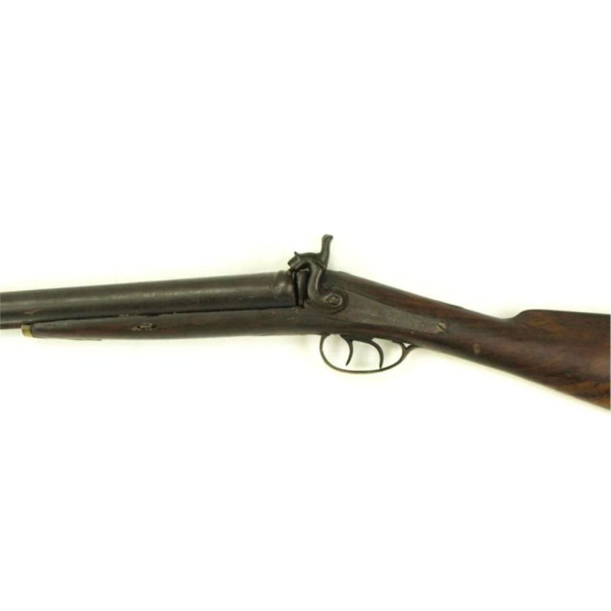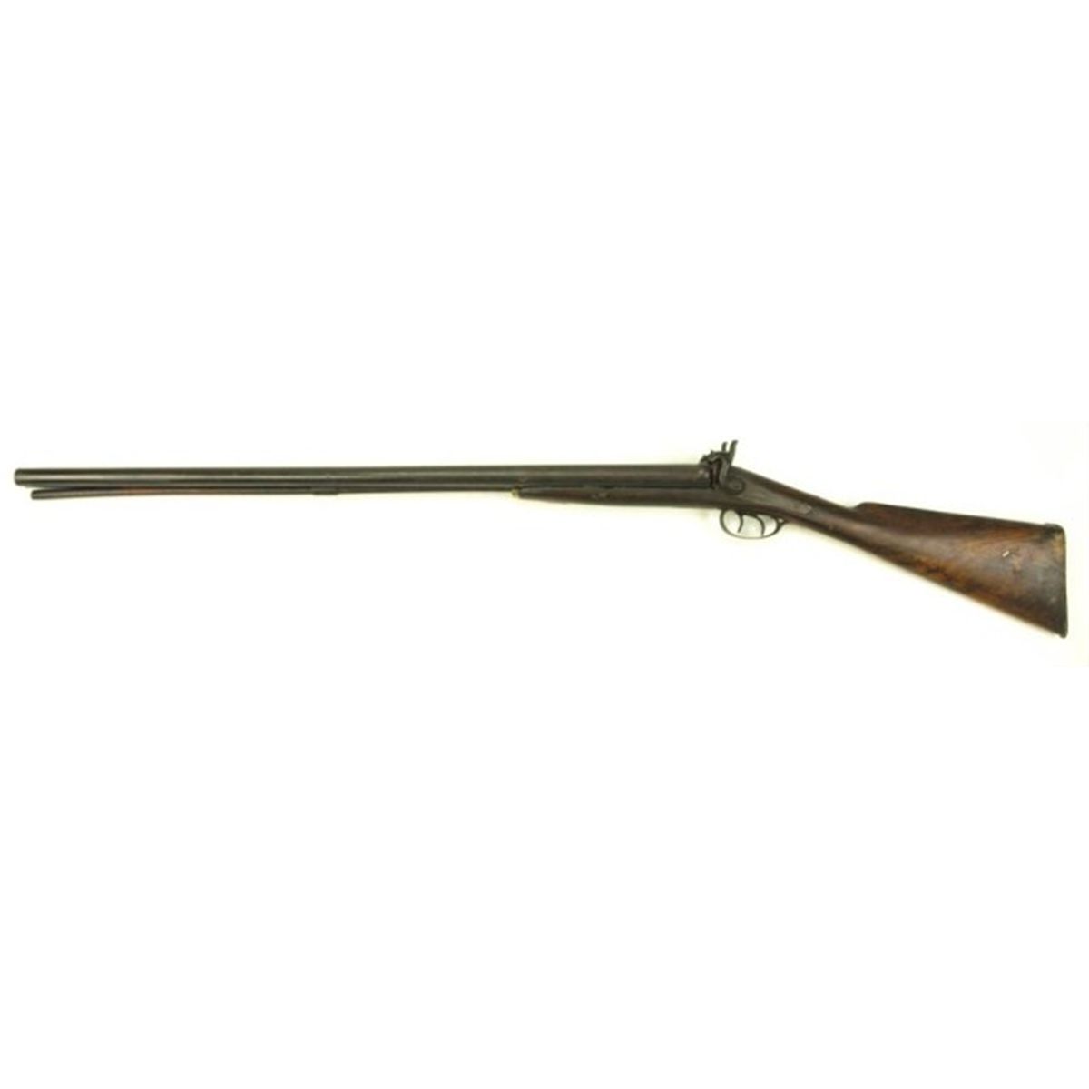 Antique double barrel muzzle loading shotgun 10 ga. NVSN all metal showing deep brown patina, original stocks with brass fittings, metal butt plate shows heavy erosion, functioning actions. NO FFL.