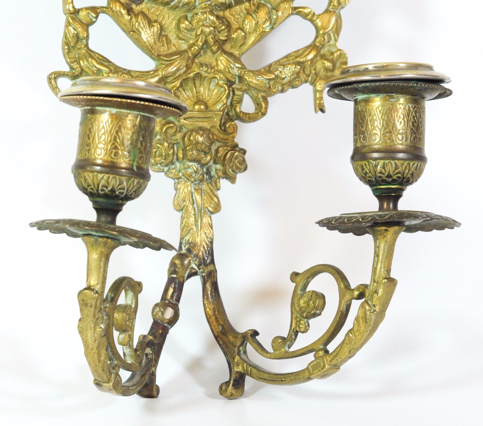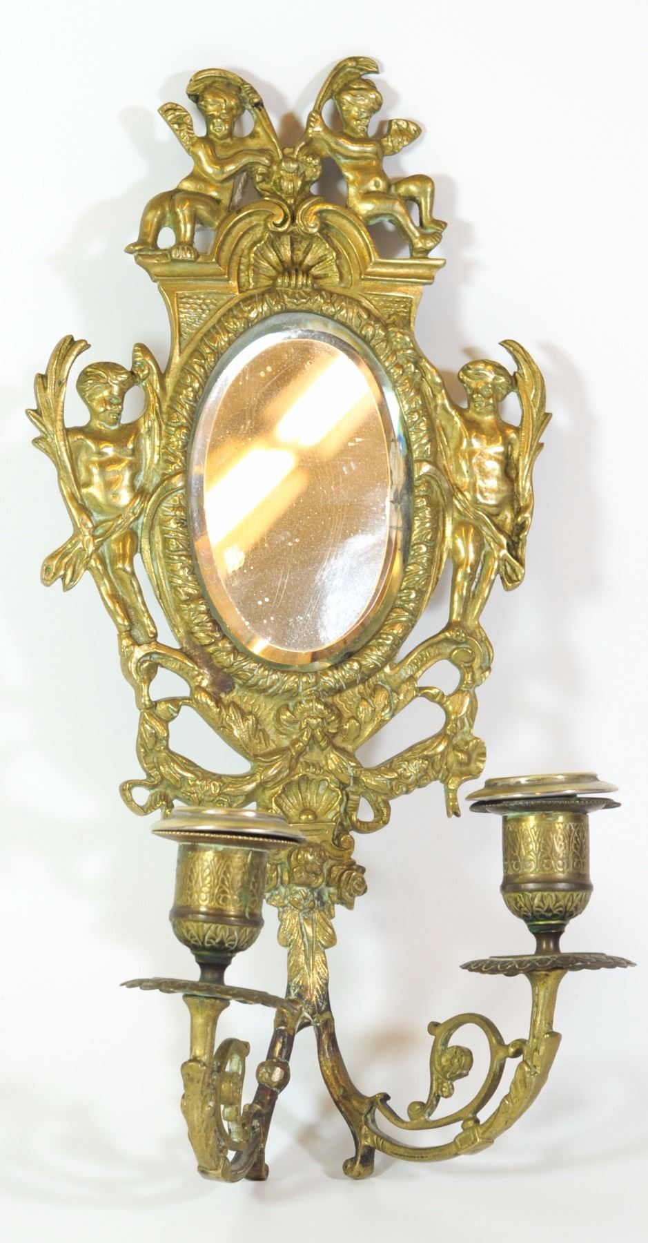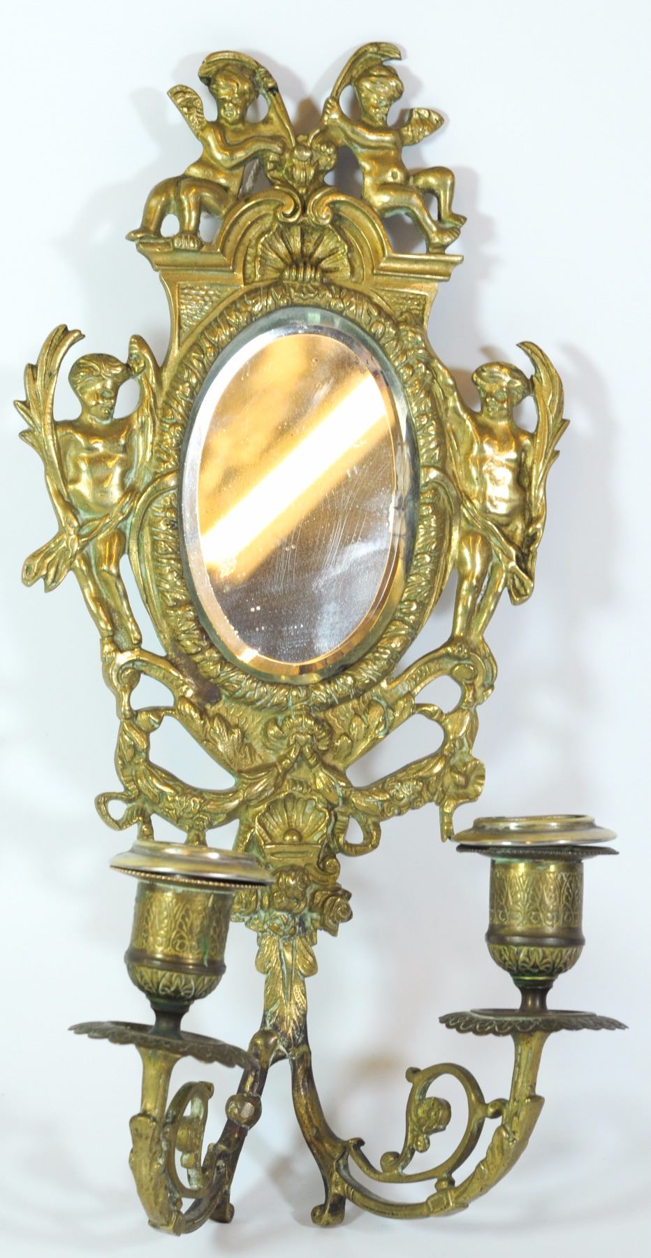 Antique double branch wall candlestick with mirror, Neo Classic design, figures of children in front and on the sides, ribbons on the botton, original crystal mirror in the middle, very good condition. Height: 35 cm.