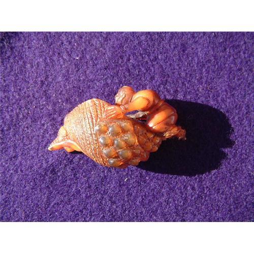 19th. century amber carving featuring a man with a monkey climbing on a shell. Amazing miniature carving in amber with minute details. Estimated value: $700.