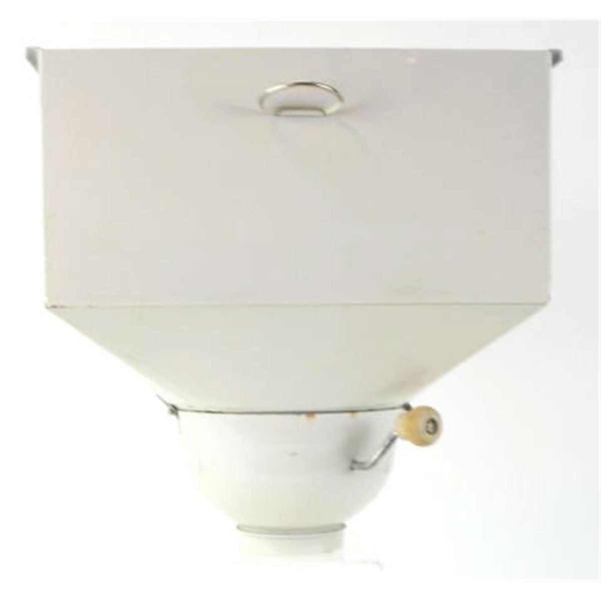 Antique flower sifter for Hoosier style cabinet in new unused condition, original label marked Kitch'n Handy complete with mounting brackets and bottom lid. Measures 10 1/2" X 9 1/2" X 11".