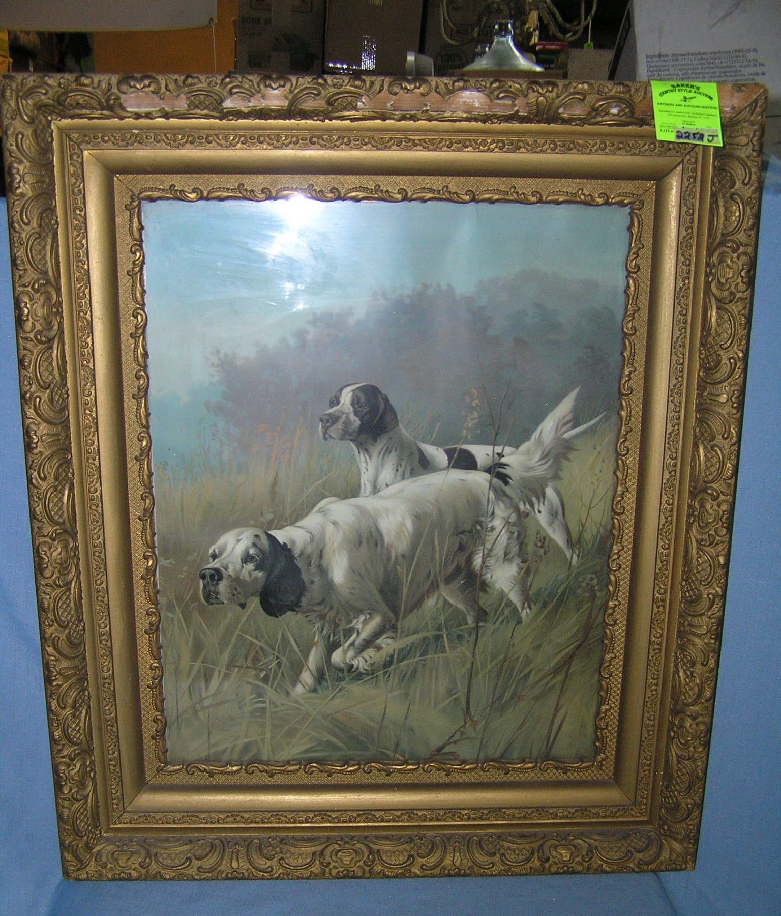 Antique framed oil on canvas painting hunting themed with 2 English Setters on the trail of the game 22 inches by 26 inches circa early 1900s see additional photos found locally in an Eastern Long Island estate est. value $7500.00-$8000.00