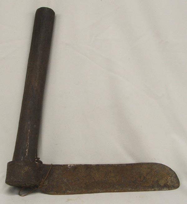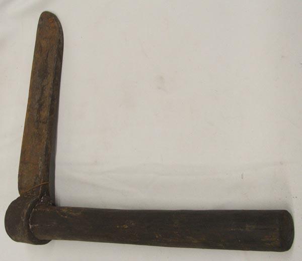 Antique froe a tool used to split out cut logs to make smaller "staves" for lathe turning or wooden "split shake roof shingles, measures approx. 14 1/2'' x 12 1/2''. SHI $25.