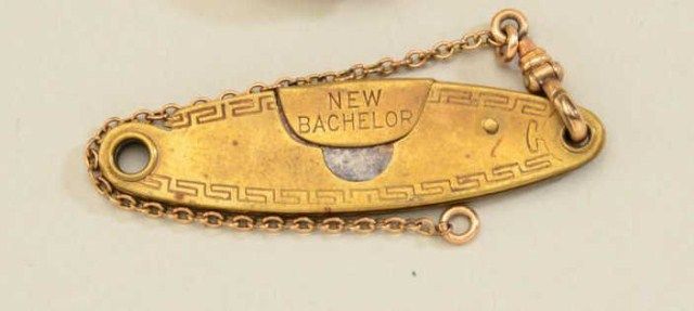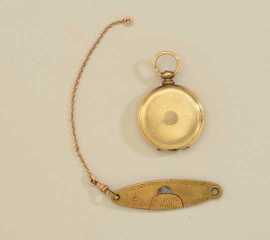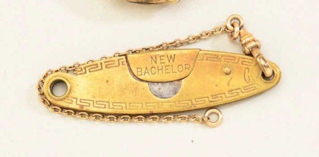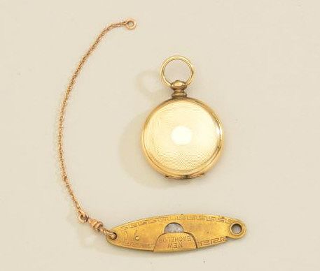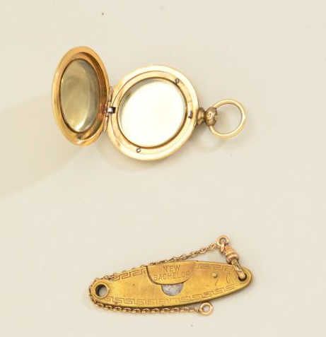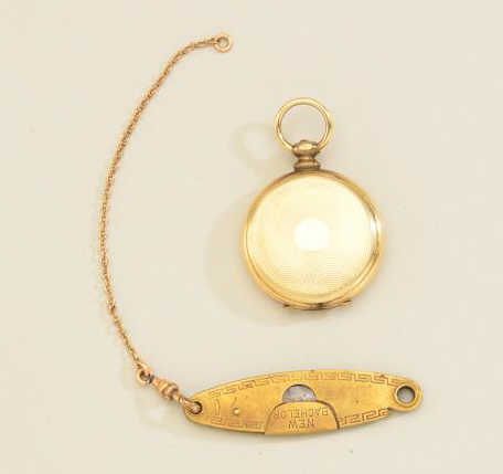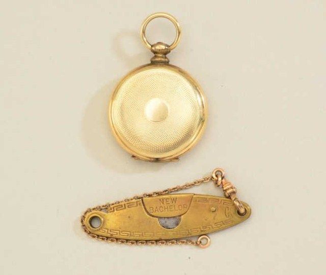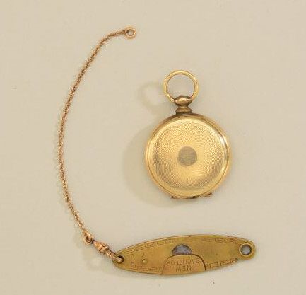 Antique gold locket approx. 1-1/2” in diameter with initials OHL engraved on the outside of the cover with two interior sides to display images or an image and gold nugget keepsakes; in overall fine condition;also an antique brass cigar cutter marked “New Bachelor” with hanging chain; contained in small riker case. Est.: $50-$100.