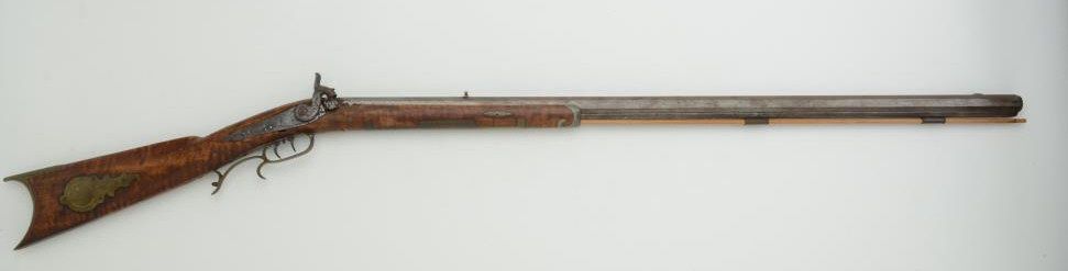 Antique half stocked percussion rifle, .32 cal., unmarked 35-1/2” octagon barrel, double set triggers, brass patchbox and mountings, replaced wood ramrod. This gun is in overall fair to good condition showing a light brownpatina to metal surfaces, action not working, stock shows scattered old mars, scratches and several old breaks at wrist; simple brass, pewter and pearl decorative inlays. Est.: $300-$500.