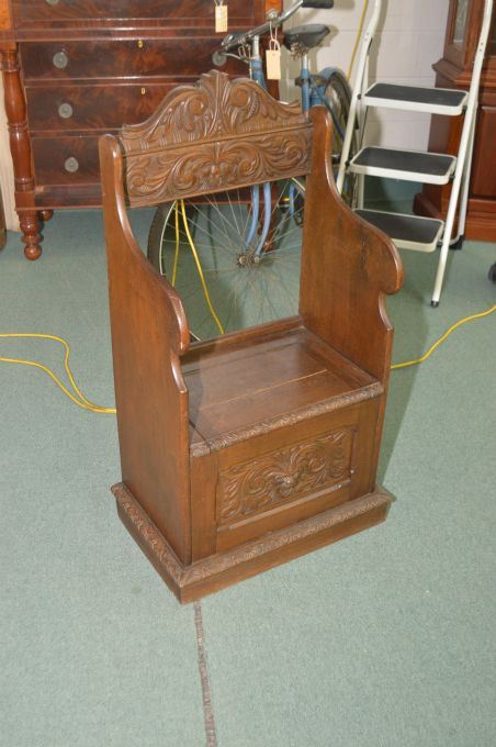 Antique hand carved oak hall bench with flip up seat, carvings including faces, scroll work etc.