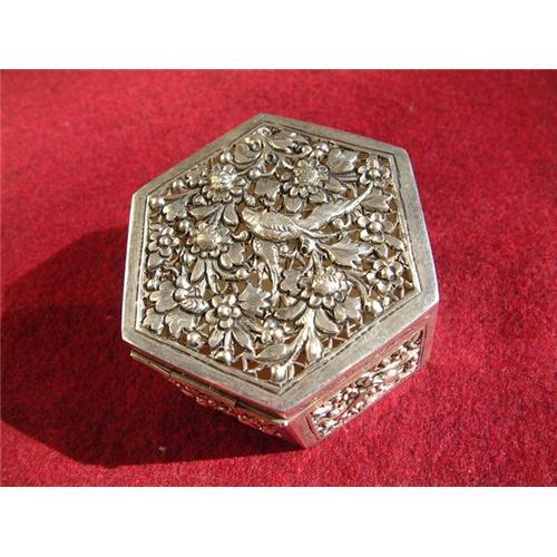 <table width="100%" border="0" cellspacing="0" cellpadding="4"><tr><td><em> </em></td></tr><tr> <td width="100%"> Antique sterling silver hexagonal box hand-decorated in high relief with birds and flowers. Marvelous art object hand chiseled and hammered of highest quality. Very rare!!!