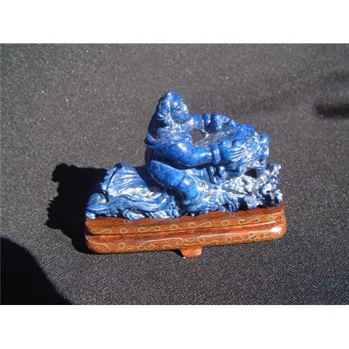 19th. century lapis lazuli carving featuring a lohan (sennin) riding a tiger. Exquisite carving of high quality deep blue lapis lazuli on custom made wooden base decorated with inlaid silver. Dimensions: length: 3.5" (9 cm.), width at the base: 1.5" (4 cm.), height: 2.5" (6.5 cm.). Estimated value: $2800.