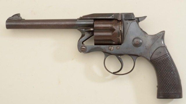 Antique large frame British Enfield MK II DA revolver, .455 cal., 5-3/4” barrel, blue finish, checkered wood grips missing butt cap, #4538. This gun is in overall good to very good condition with a mixture of tonedblue finish and brown patina, good bore, action and grips; type used by the RCMP and should be further researched. Est.: $700-$1,400.