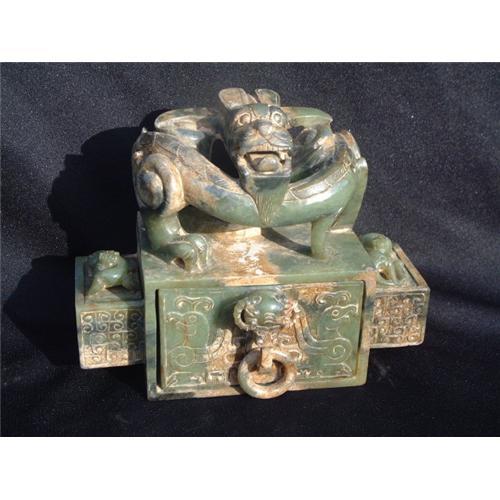 12th. century CE large green jade carving in shape of a cabinet holding a drawer containing 4 carved jade seals. The cabinet's sides have a compartment holding each an additional jade seal decorated with a dragon. The front ornament of the cabinet fetures a sheep holding a jade ring in its mouth. The back side of the cabinet is decorated with 2 facing phoenix birds. 2 phoenix birds decorate the sides of the cabinet. C-scrolls ornaments decorate the side compartments. This is an extremely rare jade carving, possibly unique of superlative decorations and size. Size: 6.8" X 8" X 4" height X length X width: (17 X 20 X 10 cm.). Estimated value: $40.000. Provenance: Dr. Veleanu's jade collection, the author of the illustrated reference book: "Jade, 5000 BC to 1912 AD, Guide to collectors".