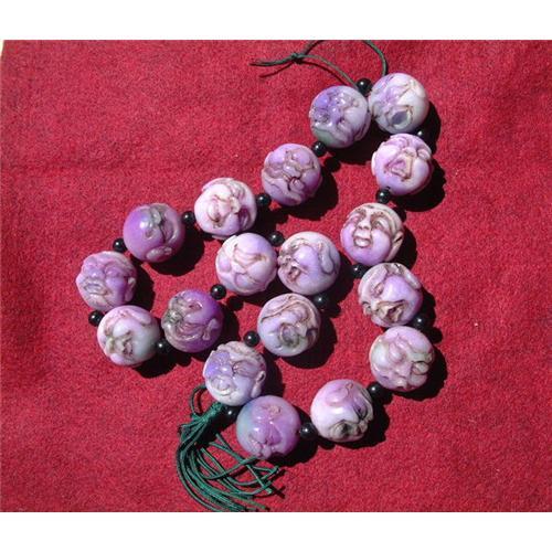Antique lavender jadeite carving in shape of Tibetan rosary (mala) made from 18 beads. Each bead is in shape of a different human head with diverse expression. This is a high quality of hand carved jade in the rare and highly sought lavender jade. Provenance: Dr. Veleanu's jade collection, the author of the collectors textbook: "Jade 5000 BC to 1912 AD". Estimated value: $2.500 (Each jade bead is valued above $150).